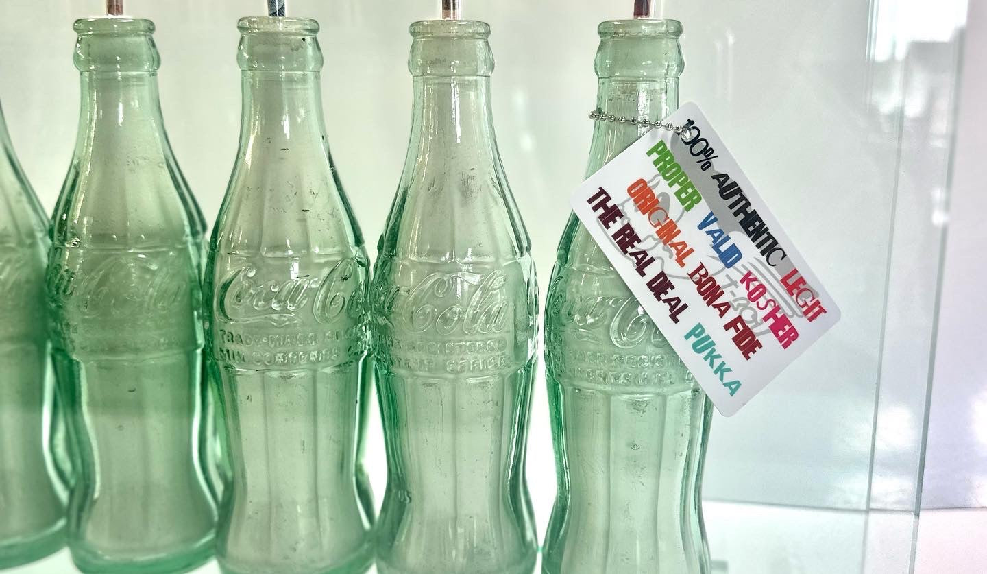 Each 60's bottle is filled with white powder and rolled currency notes from around the world.