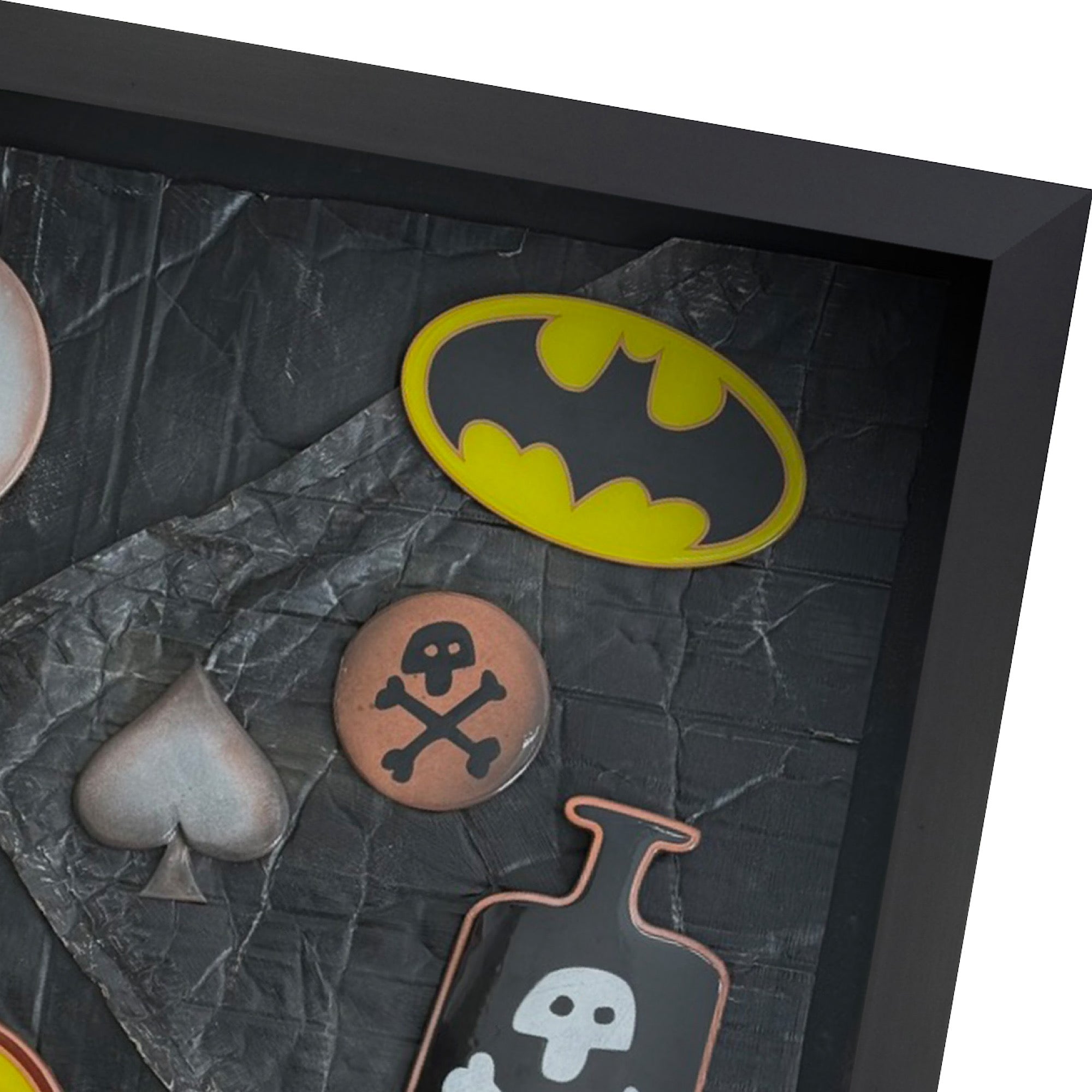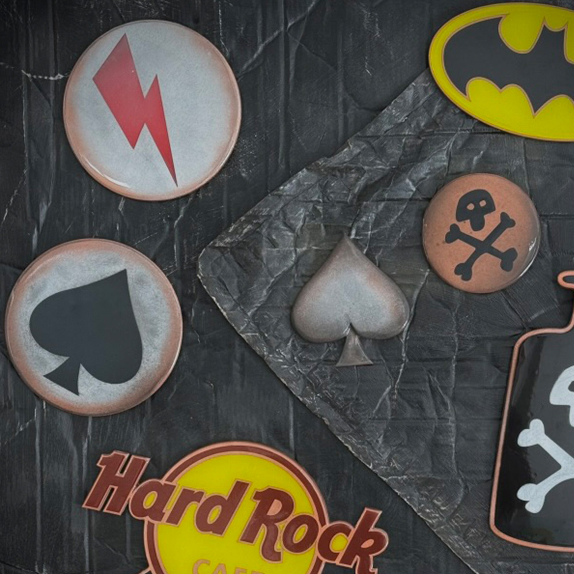 Gessoed cardboard which has been painted , distressed and manipulated to simulate leather has been used to create this supersized leather jacket.