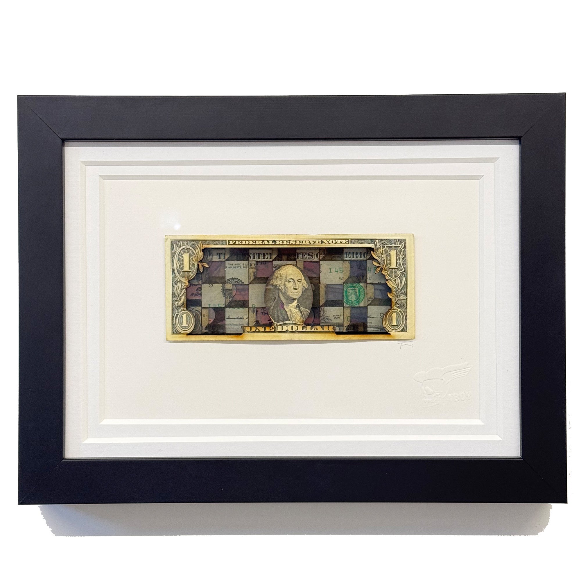 hand made piece with layers of original one dollar notes pieces together and set in resin under one dollar note
