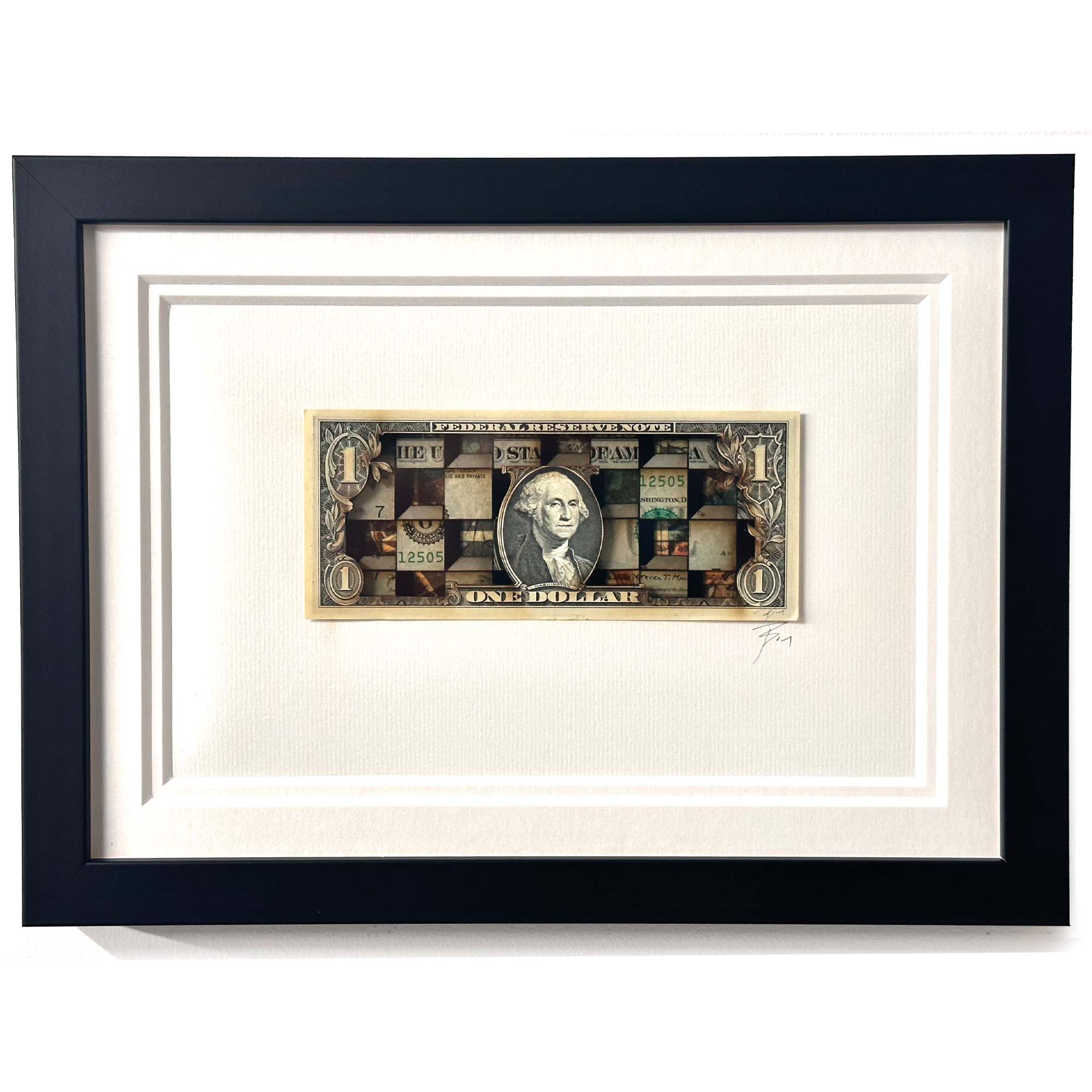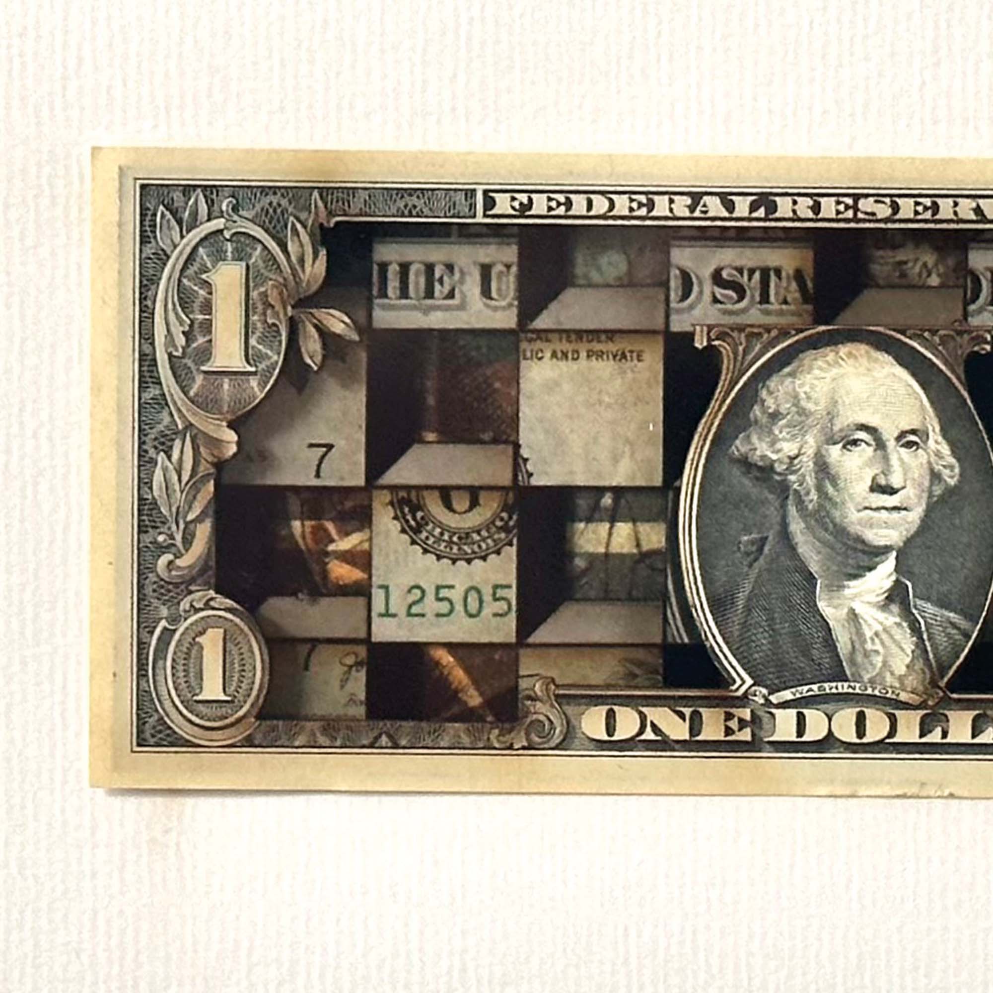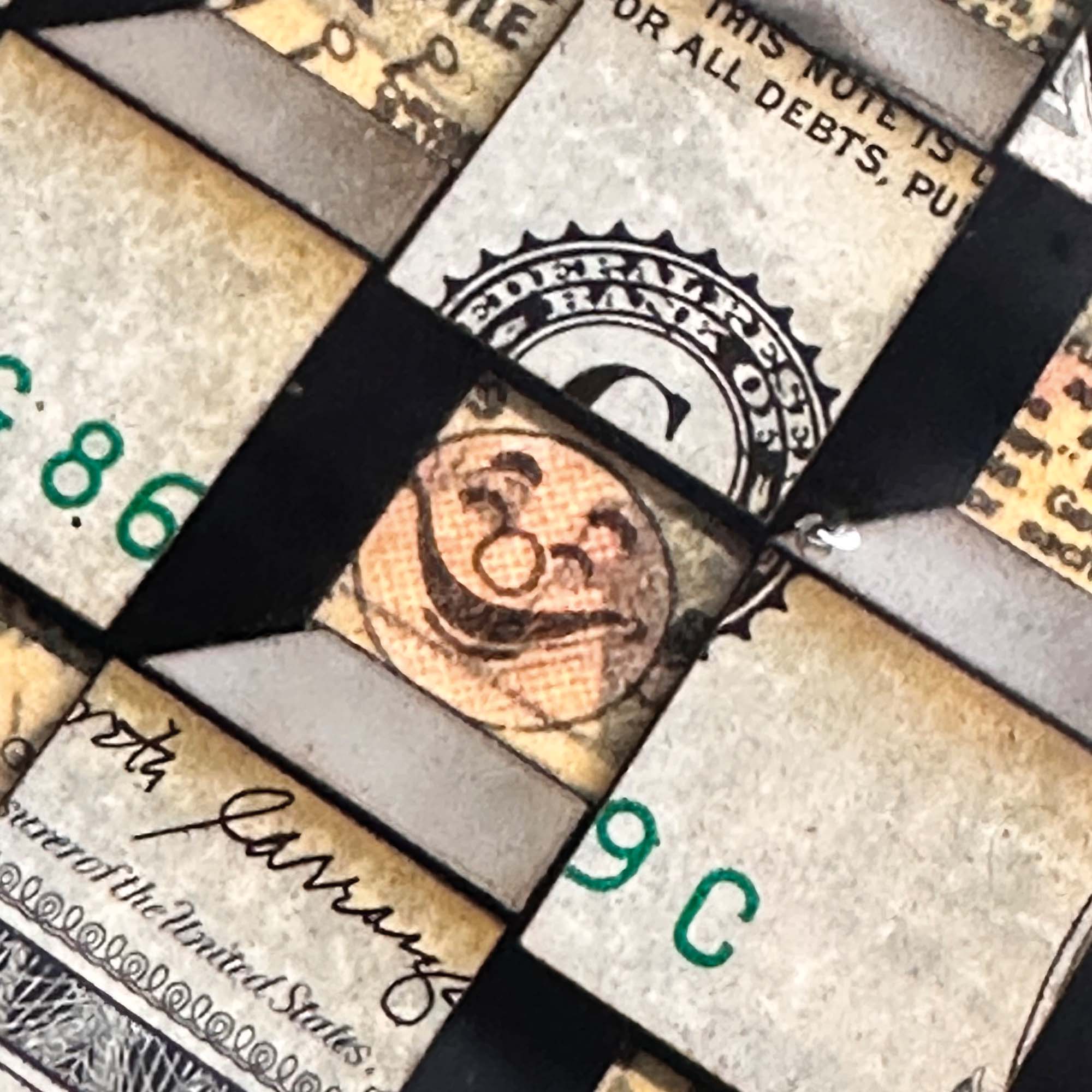 A 3D inspired note made up of multi layers of dollars with tiny individually cut pieces to create a 3D cubist effect over hand painted collage of 70's comics, the whole thing then resin covered to create a glass finish with cut and layered $1 note