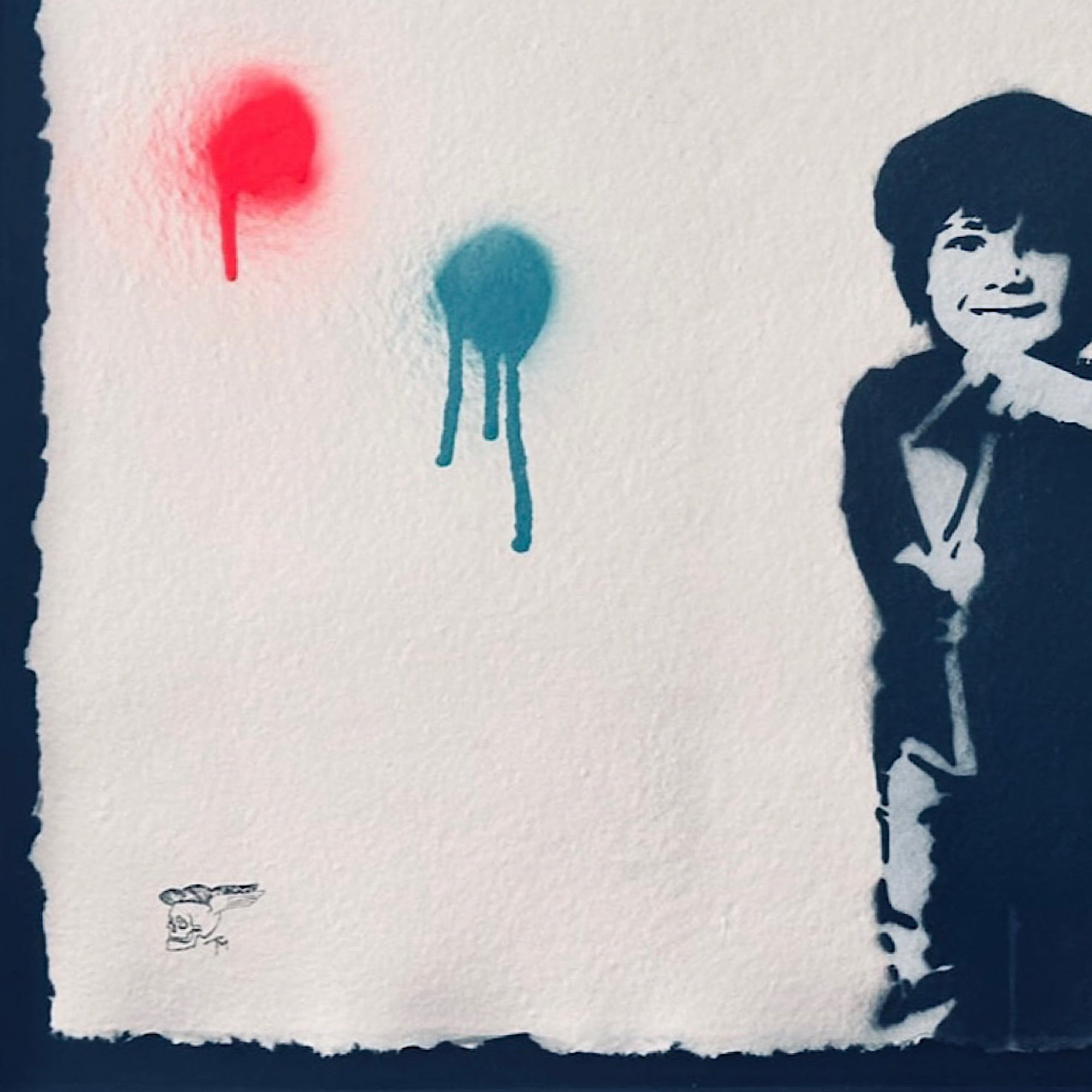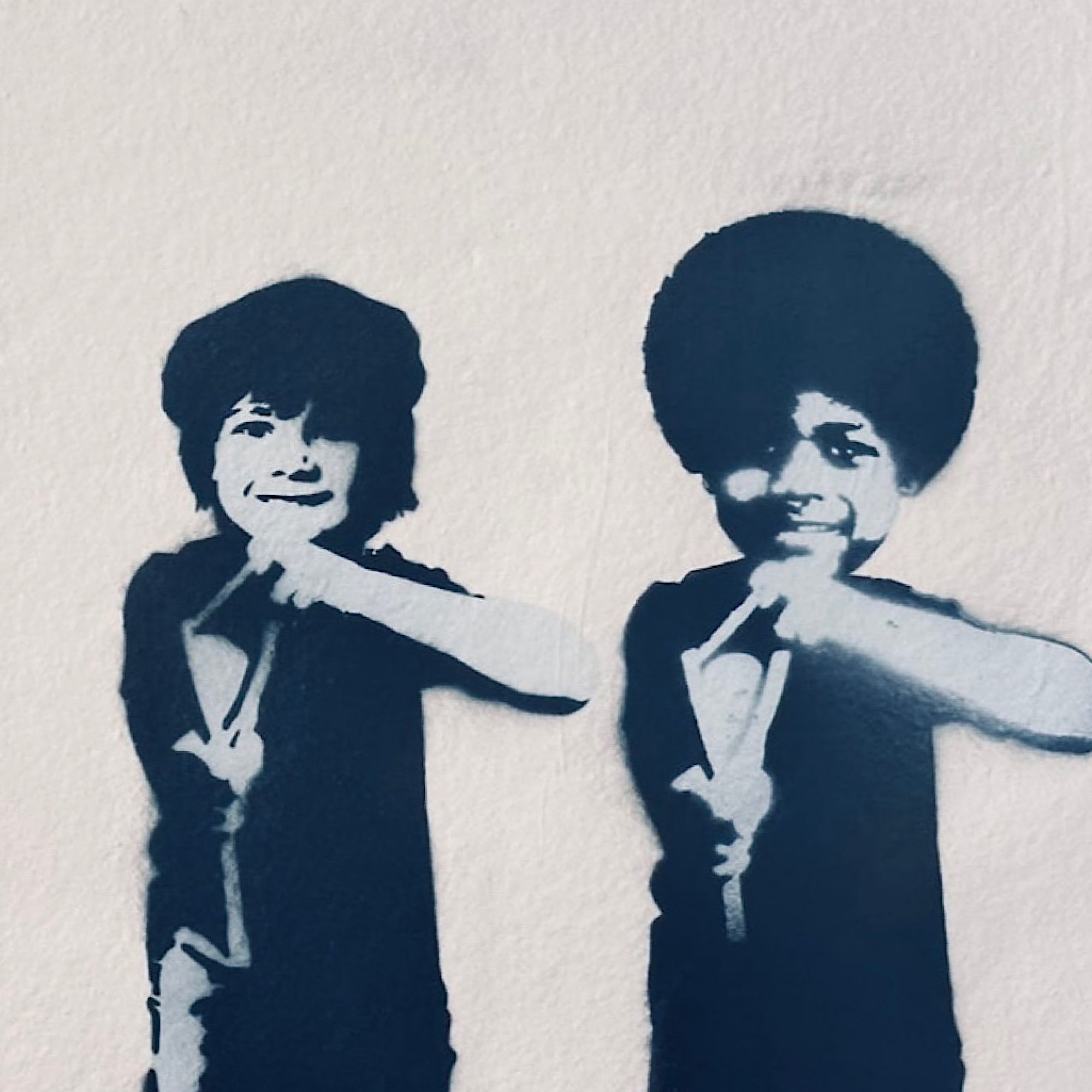 Stencil work on hand-painted background. An imagined youthful and mischievous John Travolta and Samuel L Jackson pre Pulp Fiction days.
