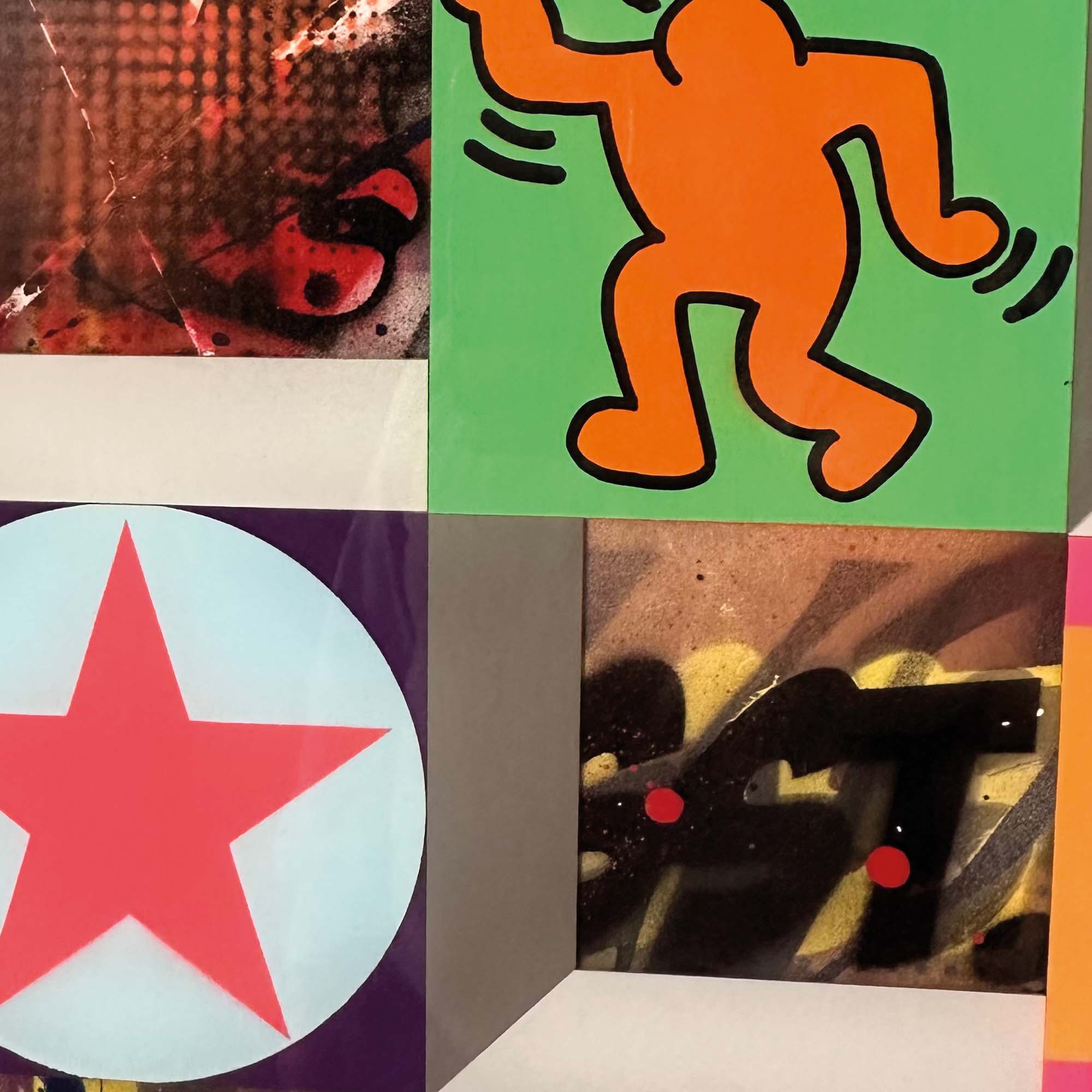 The whole piece started out as a pop art abstract created with spray cans, stencils, free hand and acrylic; I then overlaid painted layers of pieces and finally 7 layers of resin were added then cut back and polished to create a glass finish.