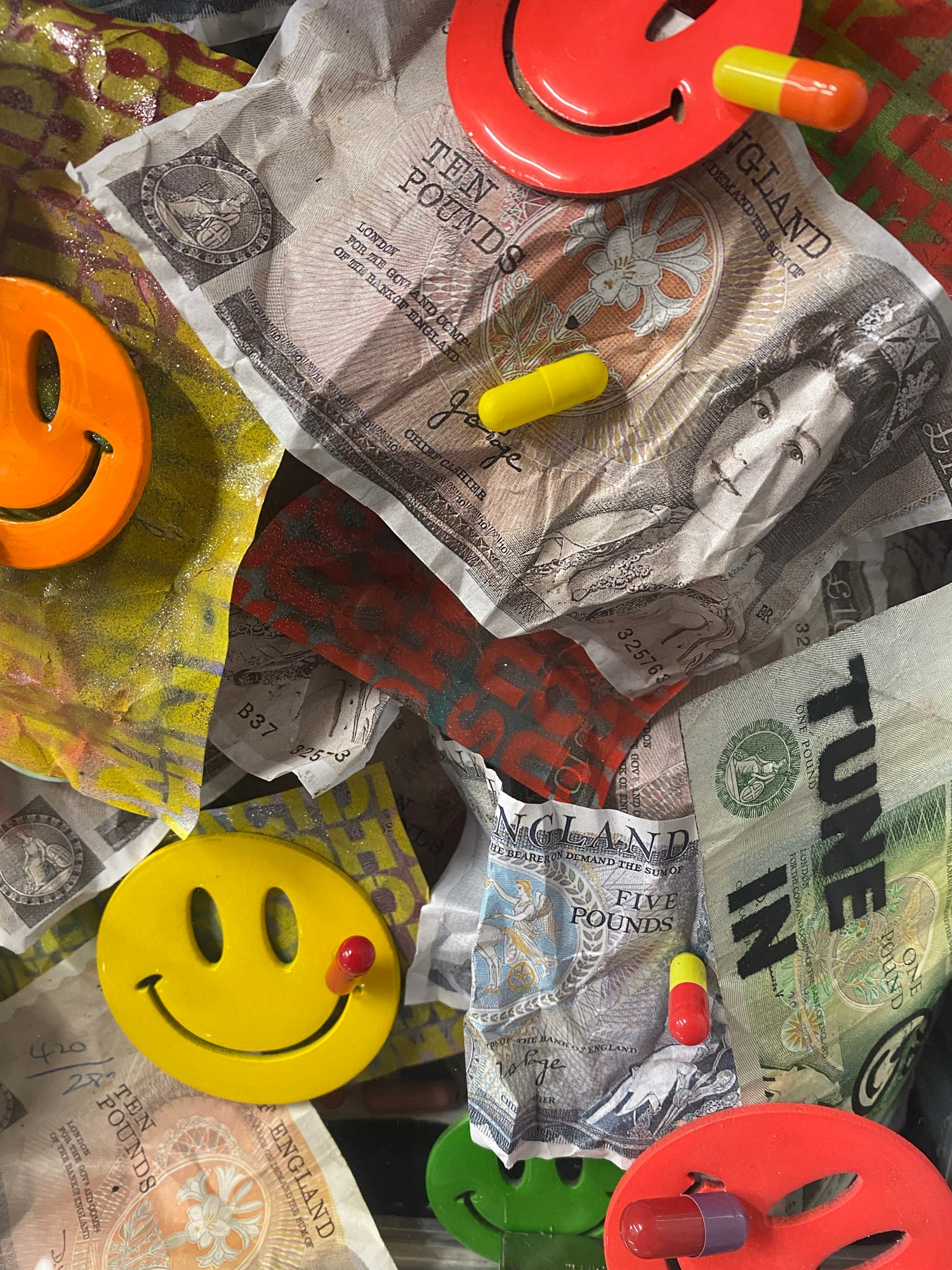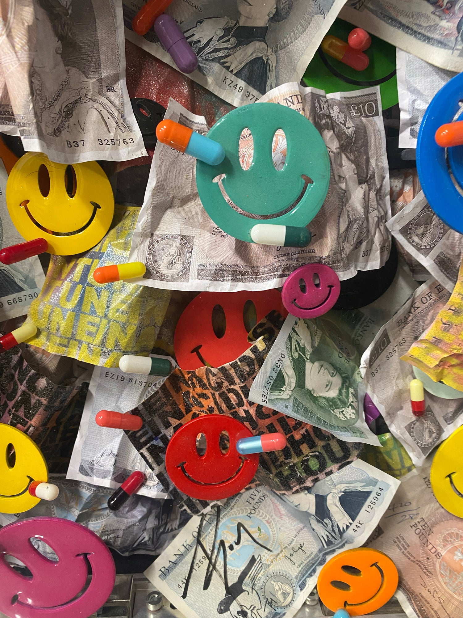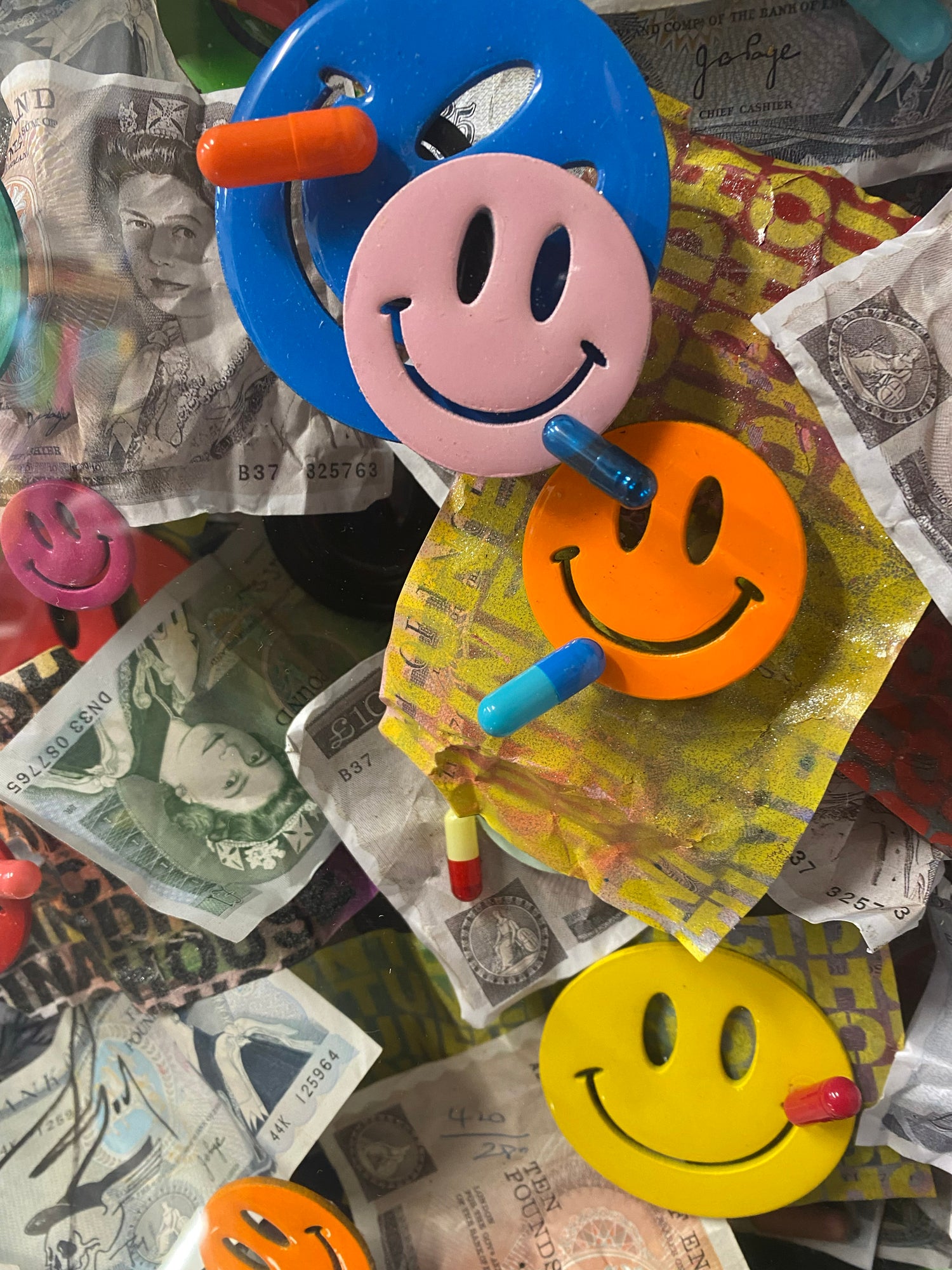 Original time capsule case with floated cash art pieces and pills with cut , painted and resin coated smileys along with original artefacts from 1988. The whole piece is floated into a hand made acrylic box frame.