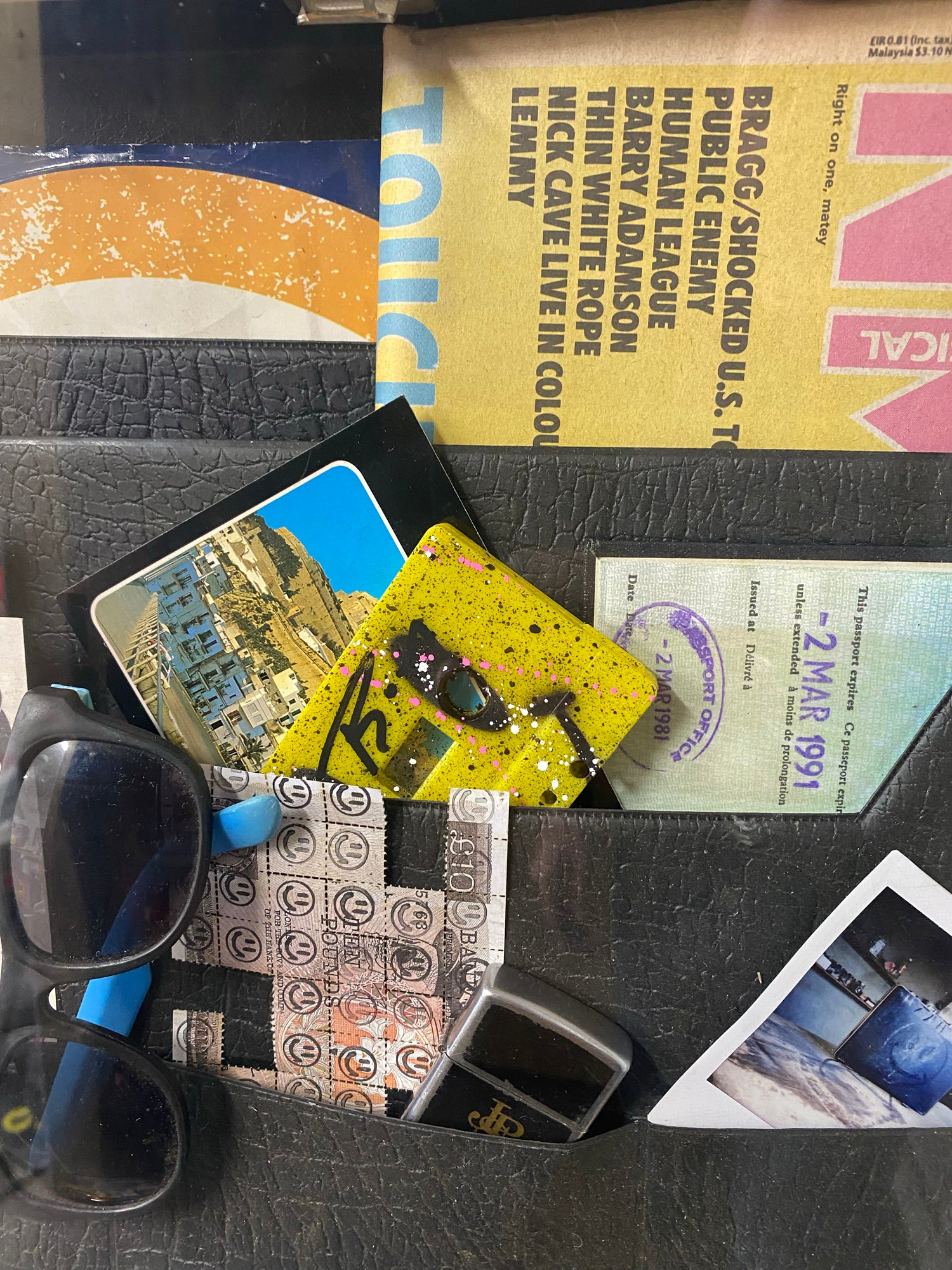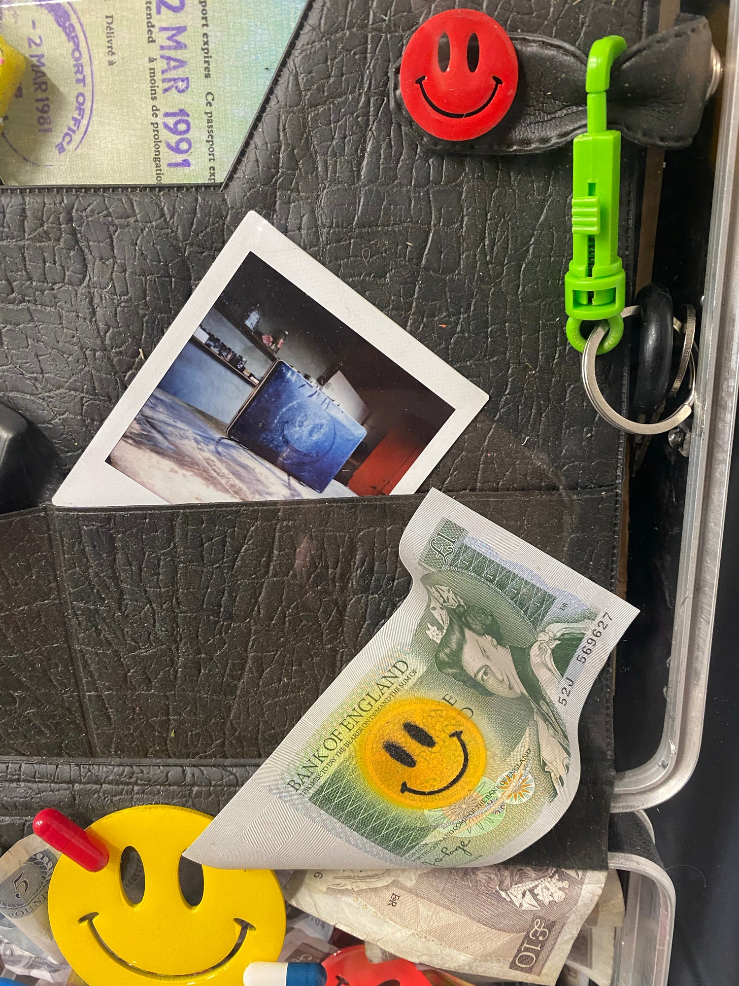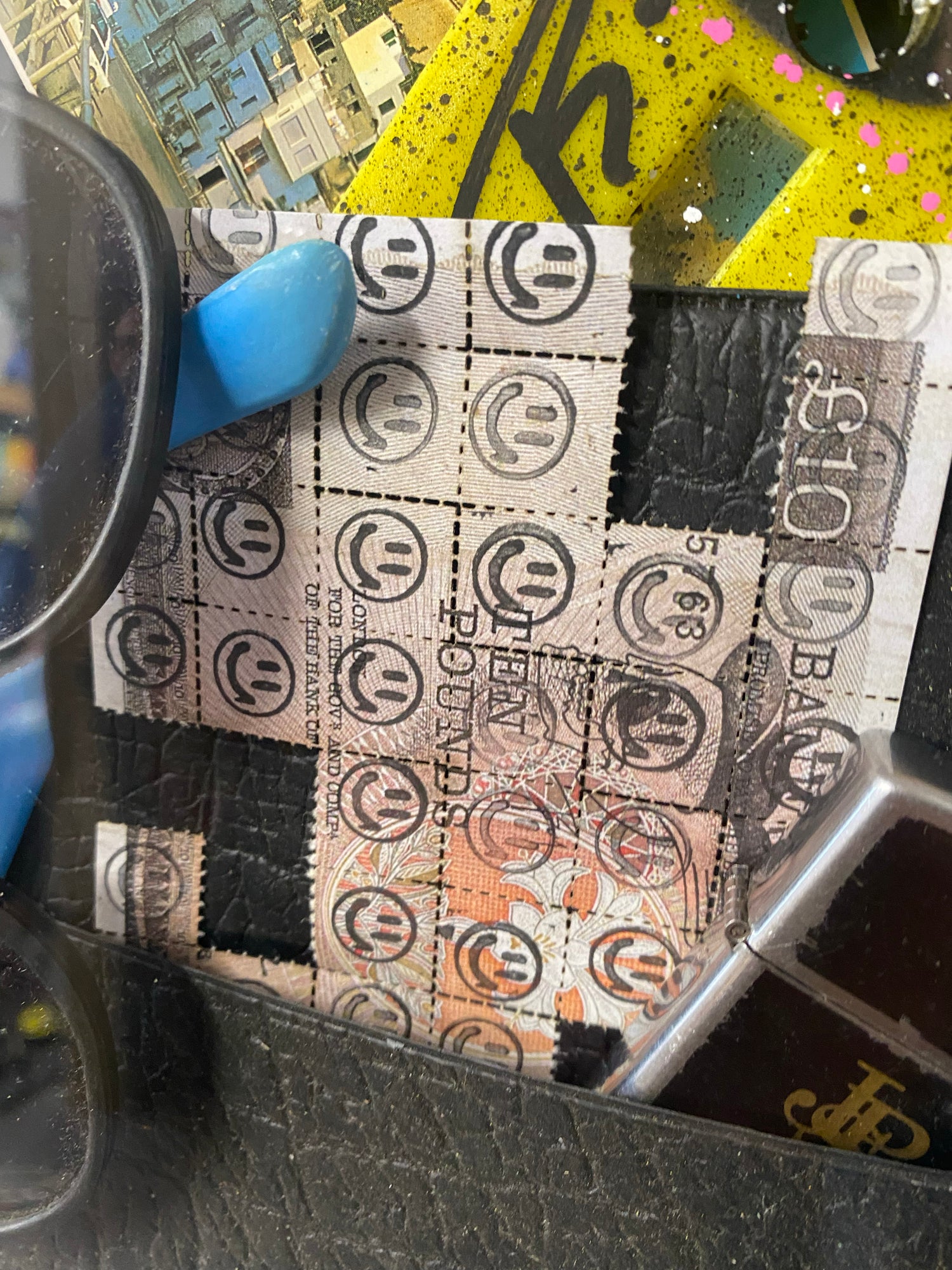 Original time capsule case with floated cash art pieces and pills with cut , painted and resin coated smileys along with original artefacts from 1988. The whole piece is floated into a hand made acrylic box frame.
