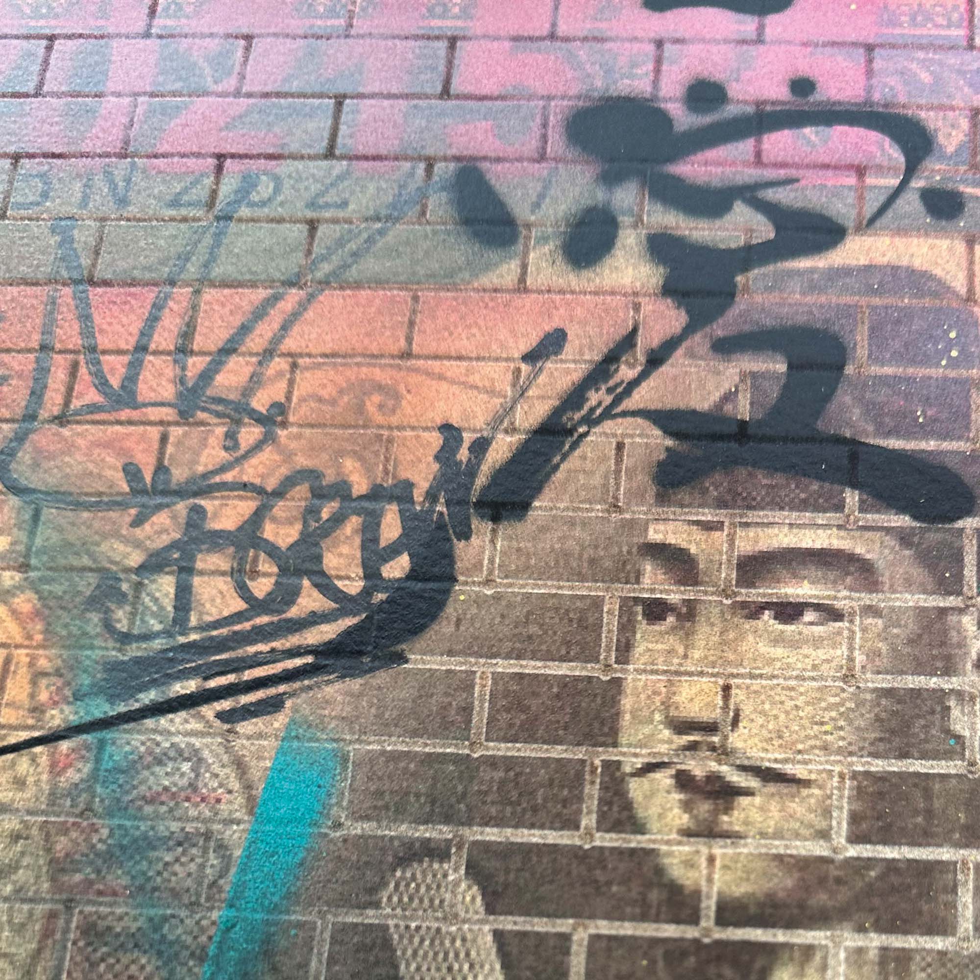 Giclée print 5000 Yen note with laser cut bricks and original spray can work, into box frame.