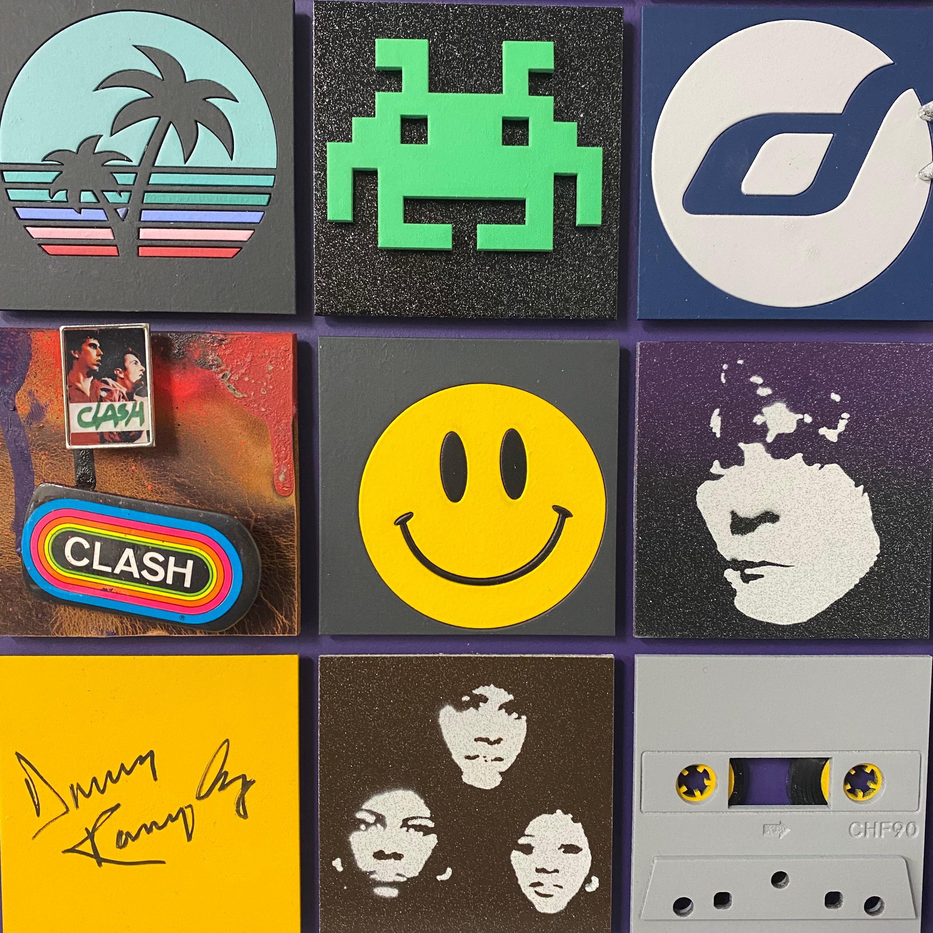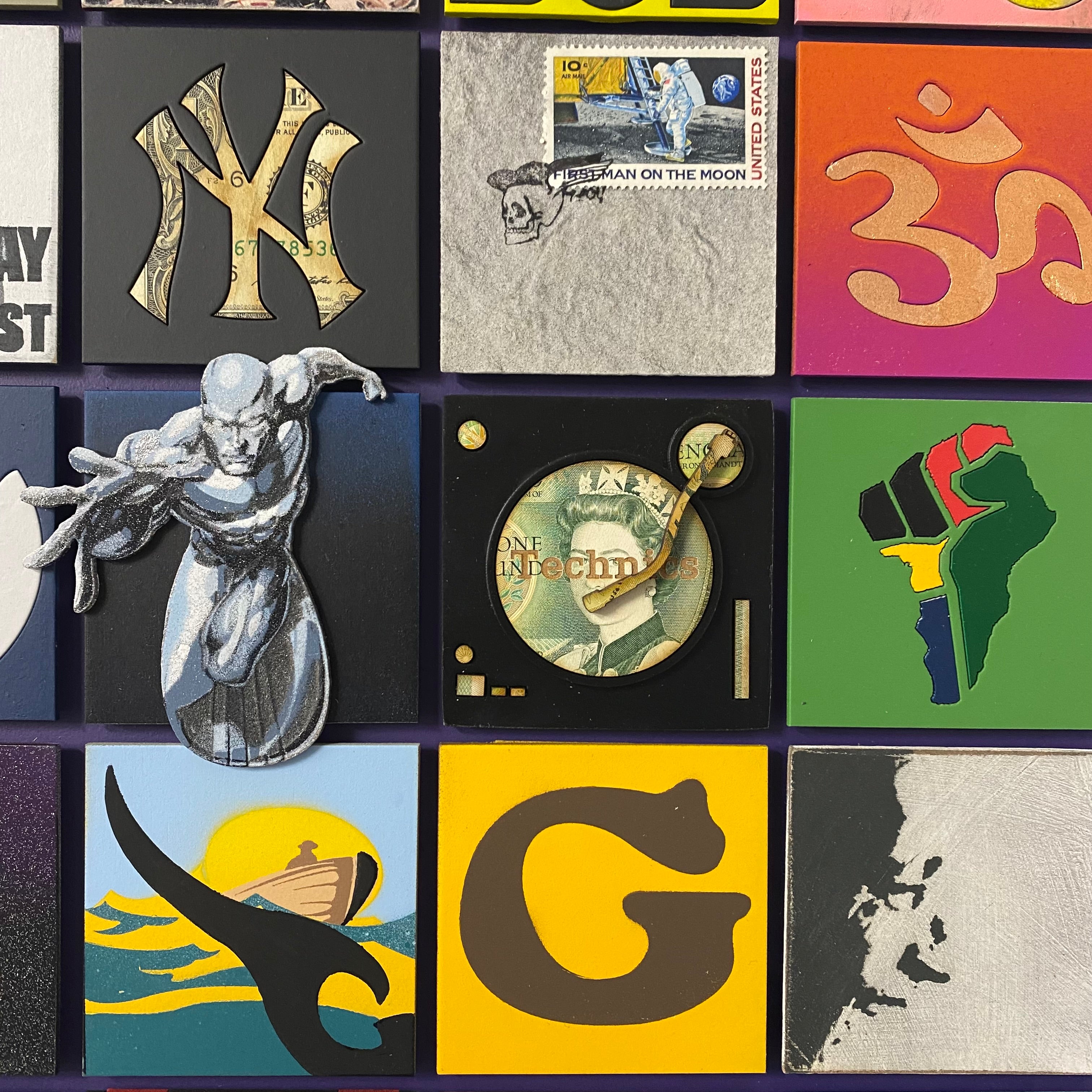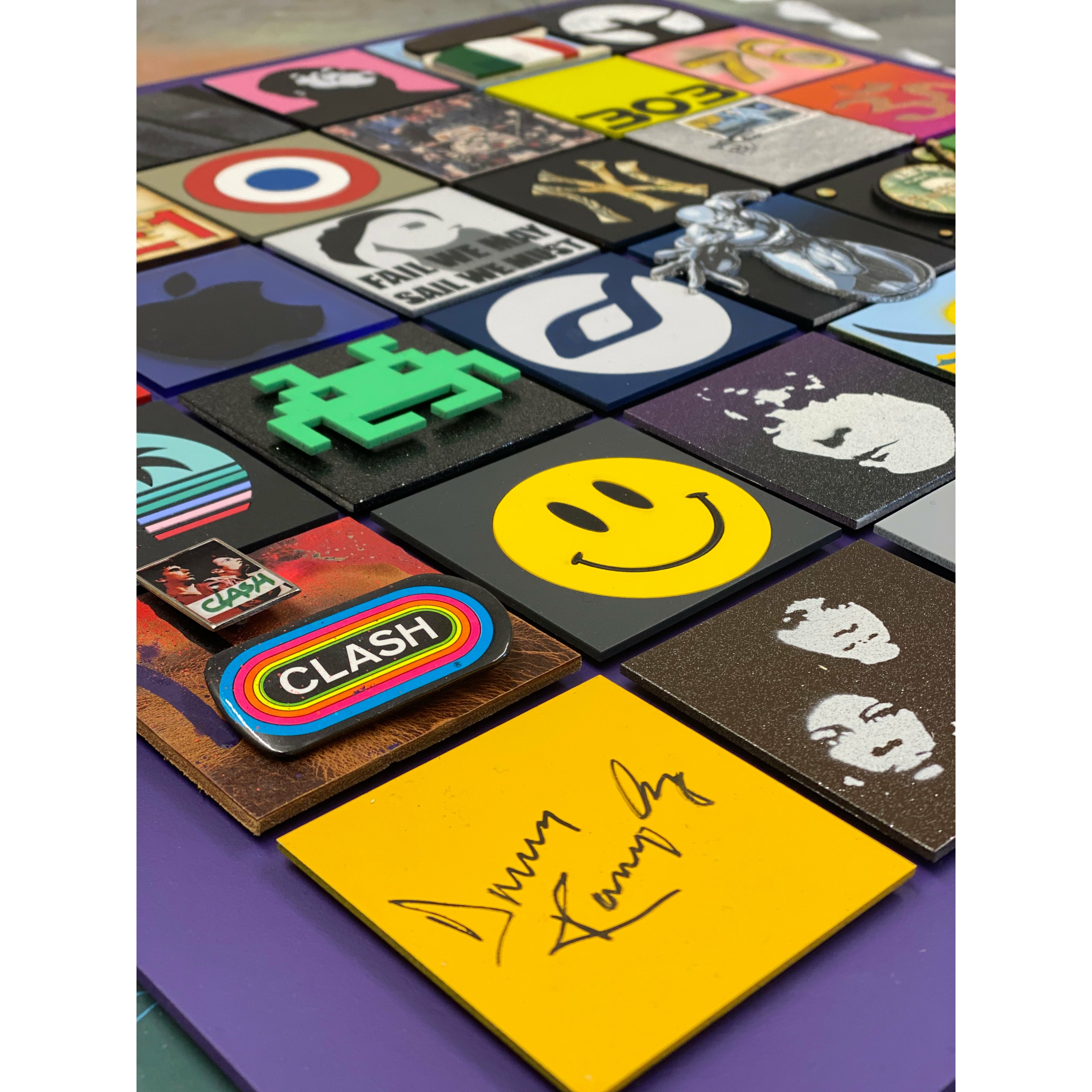 Made with 36 squares of cut board to create 3D pieces of sculpture, collage, graffiti, paintings and drawings, each piece is an influential moment in his life. Each one of 5 original pieces are unique.