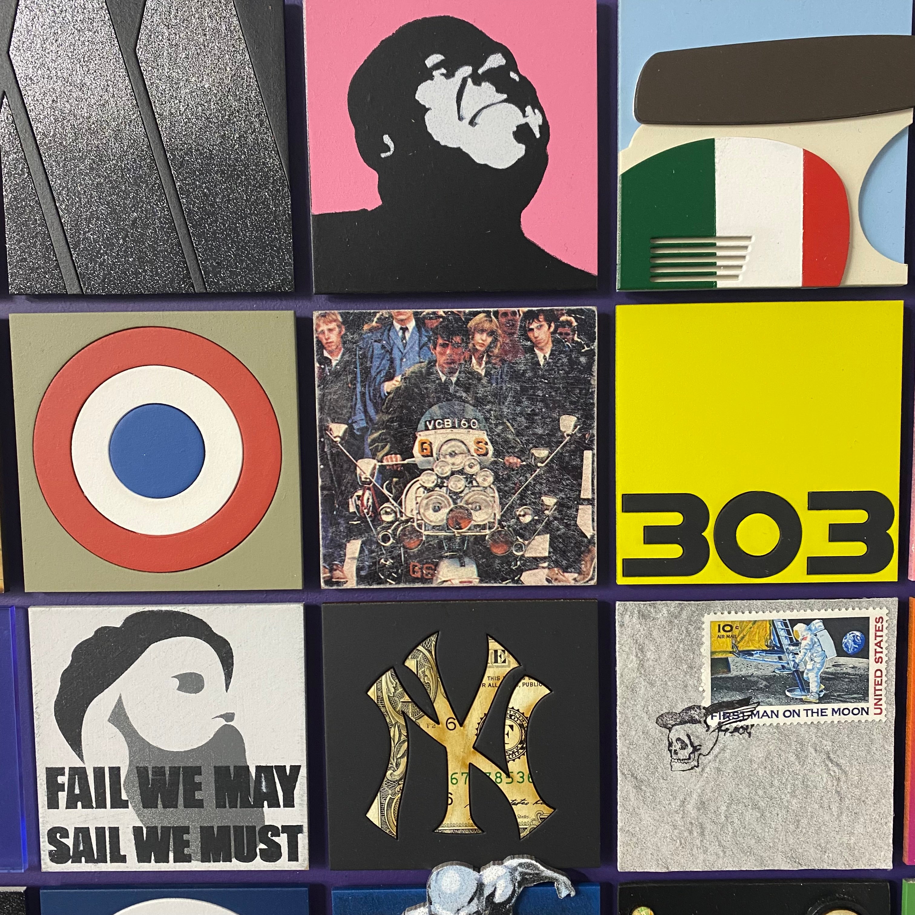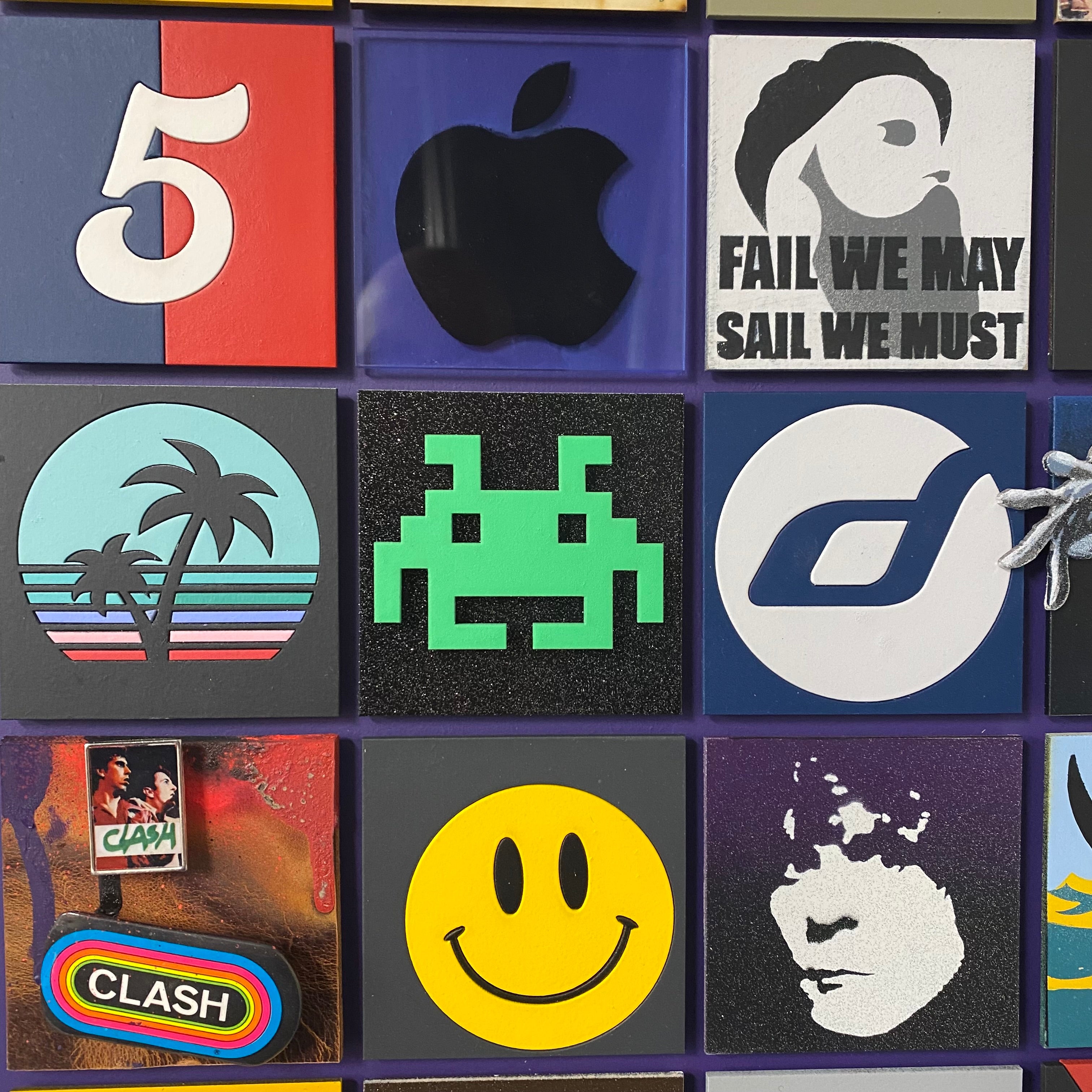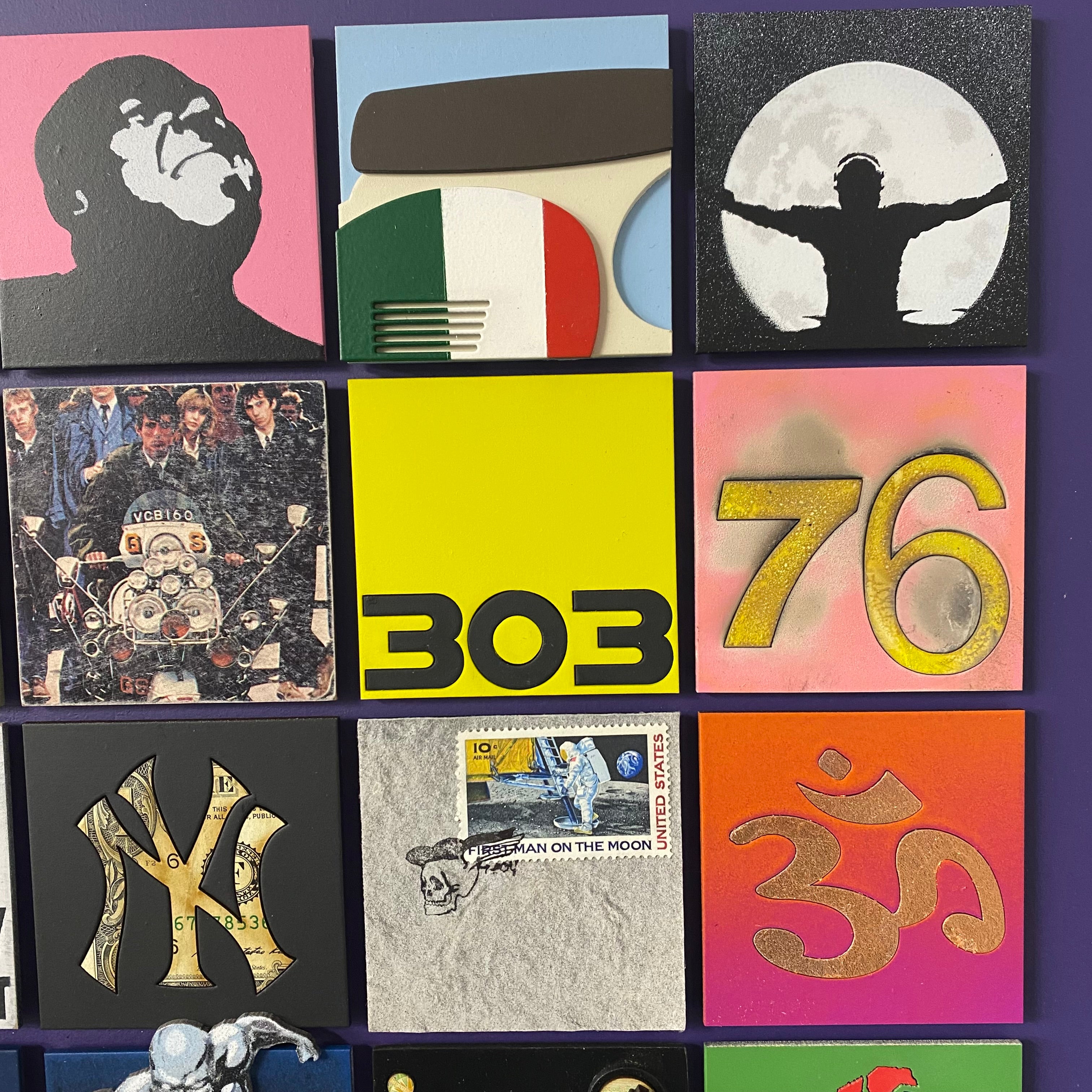 Made with 36 squares of cut board to create 3D pieces of sculpture, collage, graffiti, paintings and drawings, each piece is an influential moment in his life. Each one of 5 original pieces are unique.