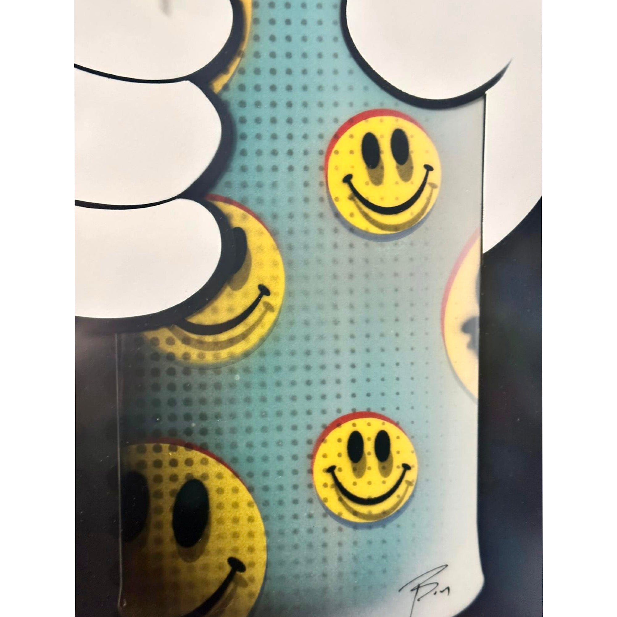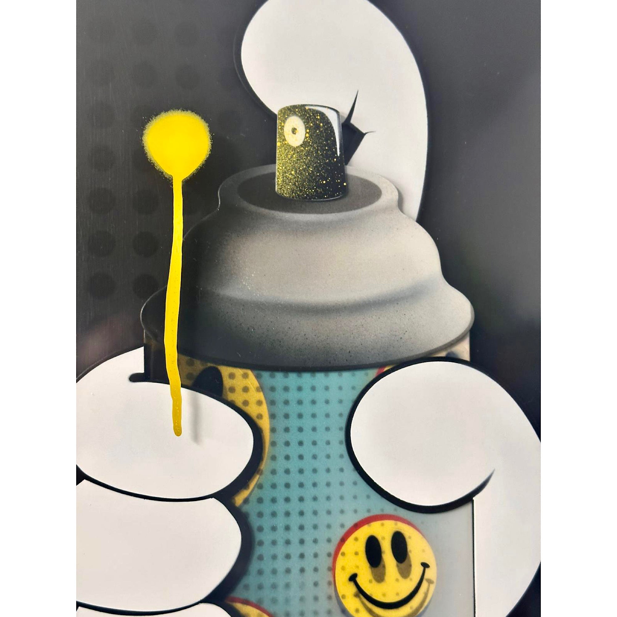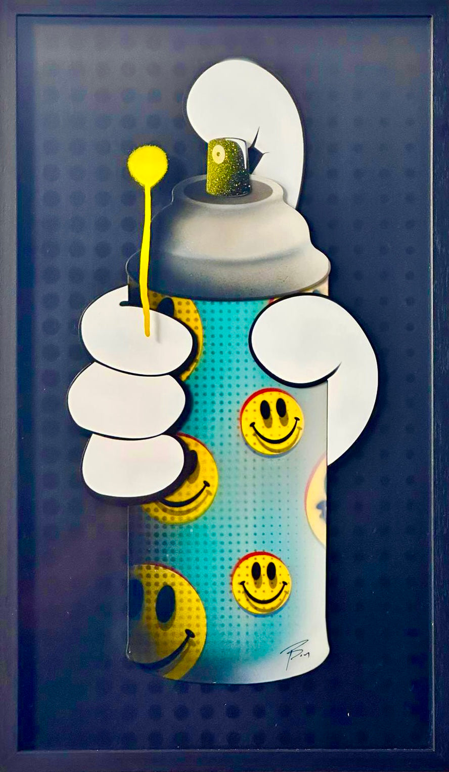 Laser-cut and hand-finished spray-can with half tone detailing and smiley faces.