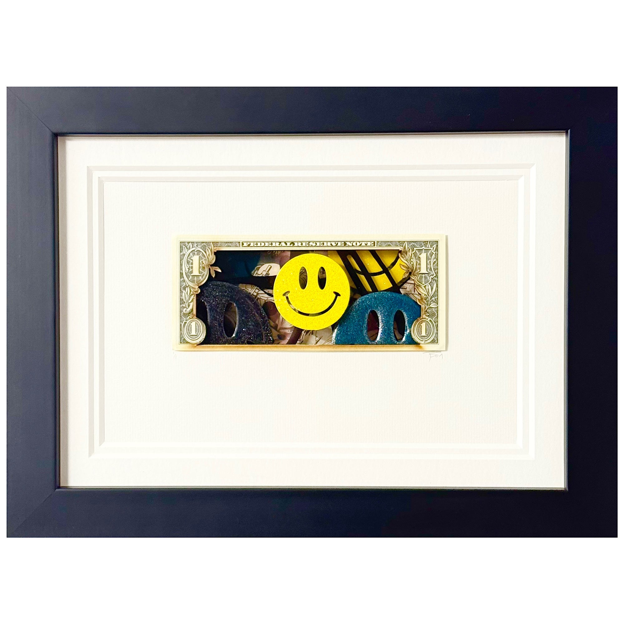 Cut and resin coated painted pieces, layered over vintage comics, under a genuine $1 bill