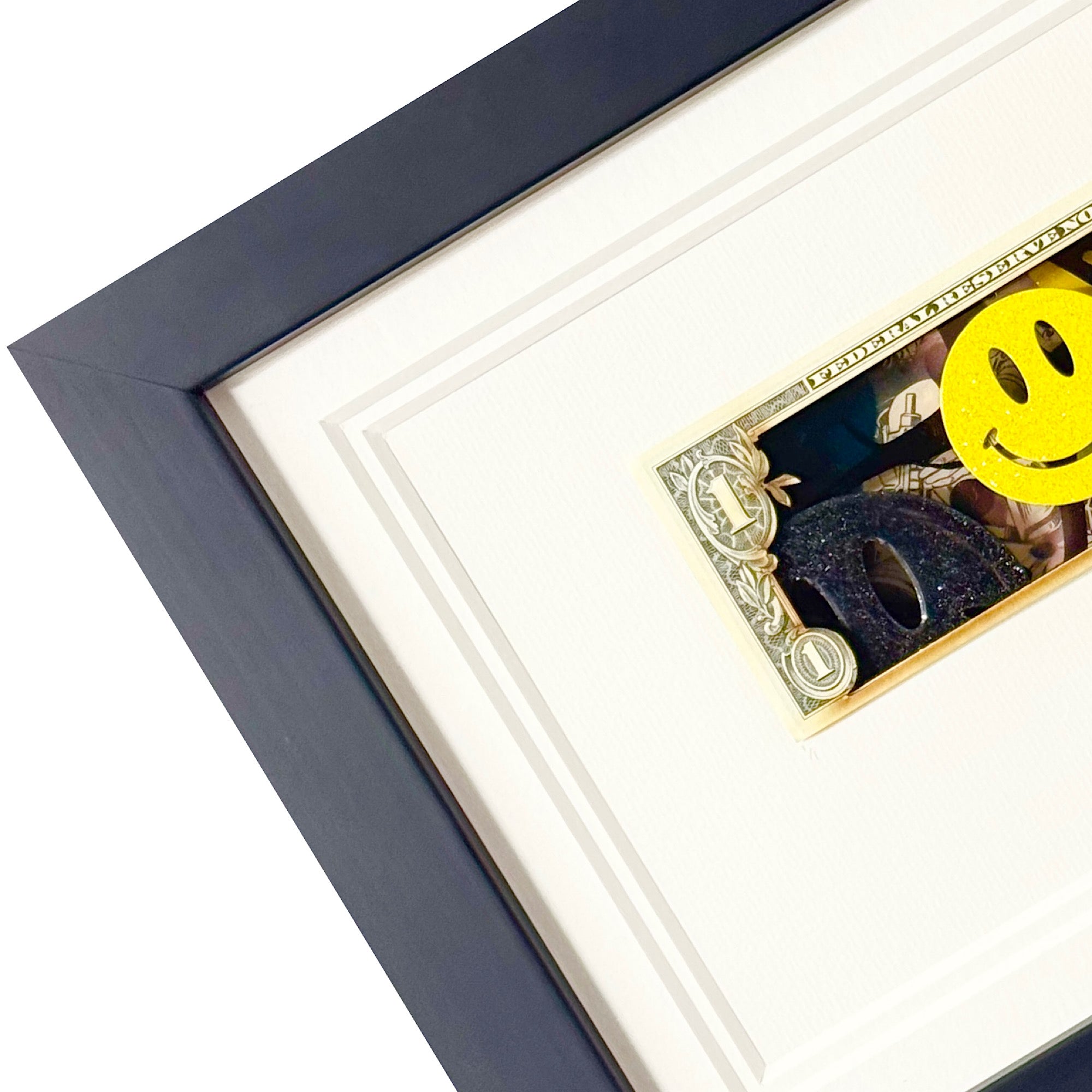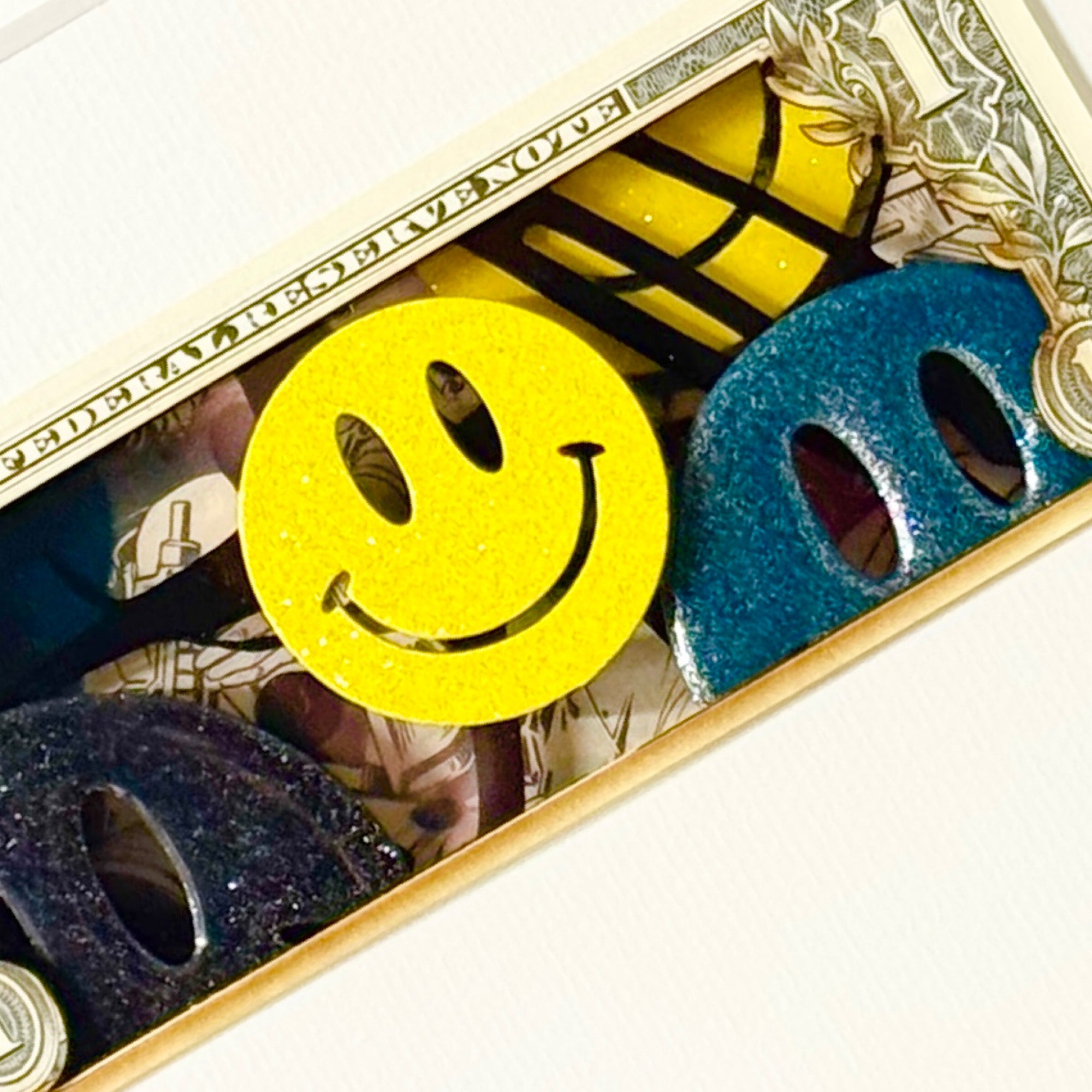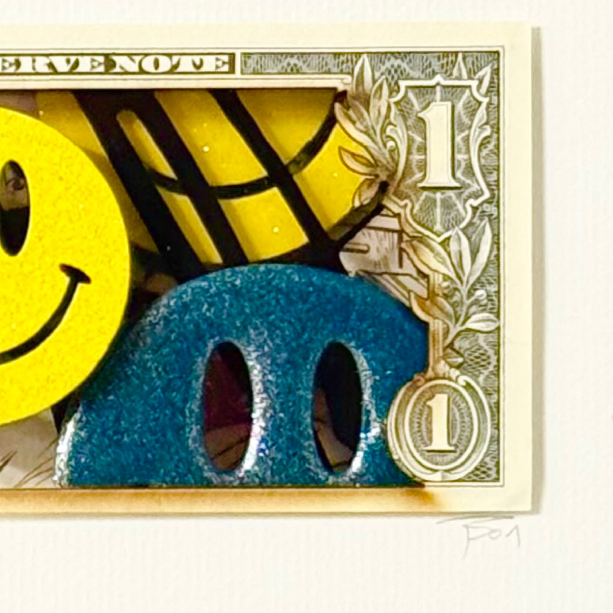 Cut and resin coated painted pieces, layered over vintage comics, under a genuine $1 bill