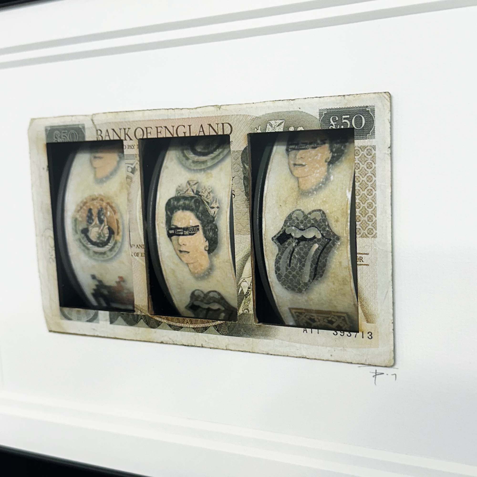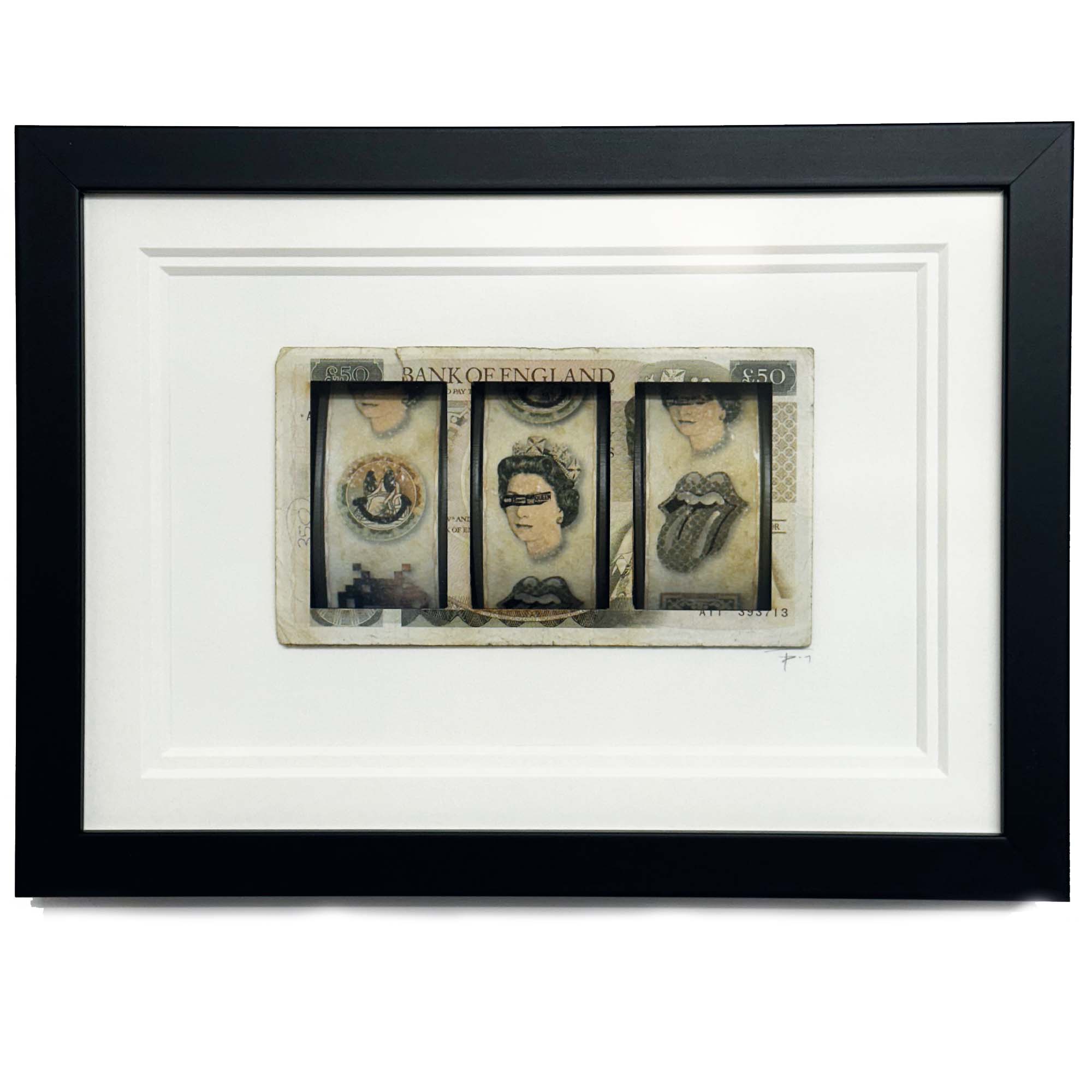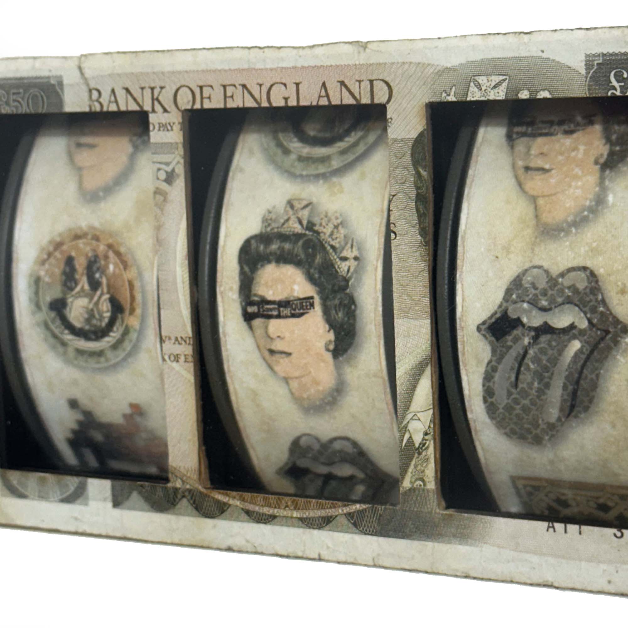 Inspired by my childhood and a misspent youth on fruit machines! Original £50 note with reimagined reels depicting iconic redrawn parts of the bank note .