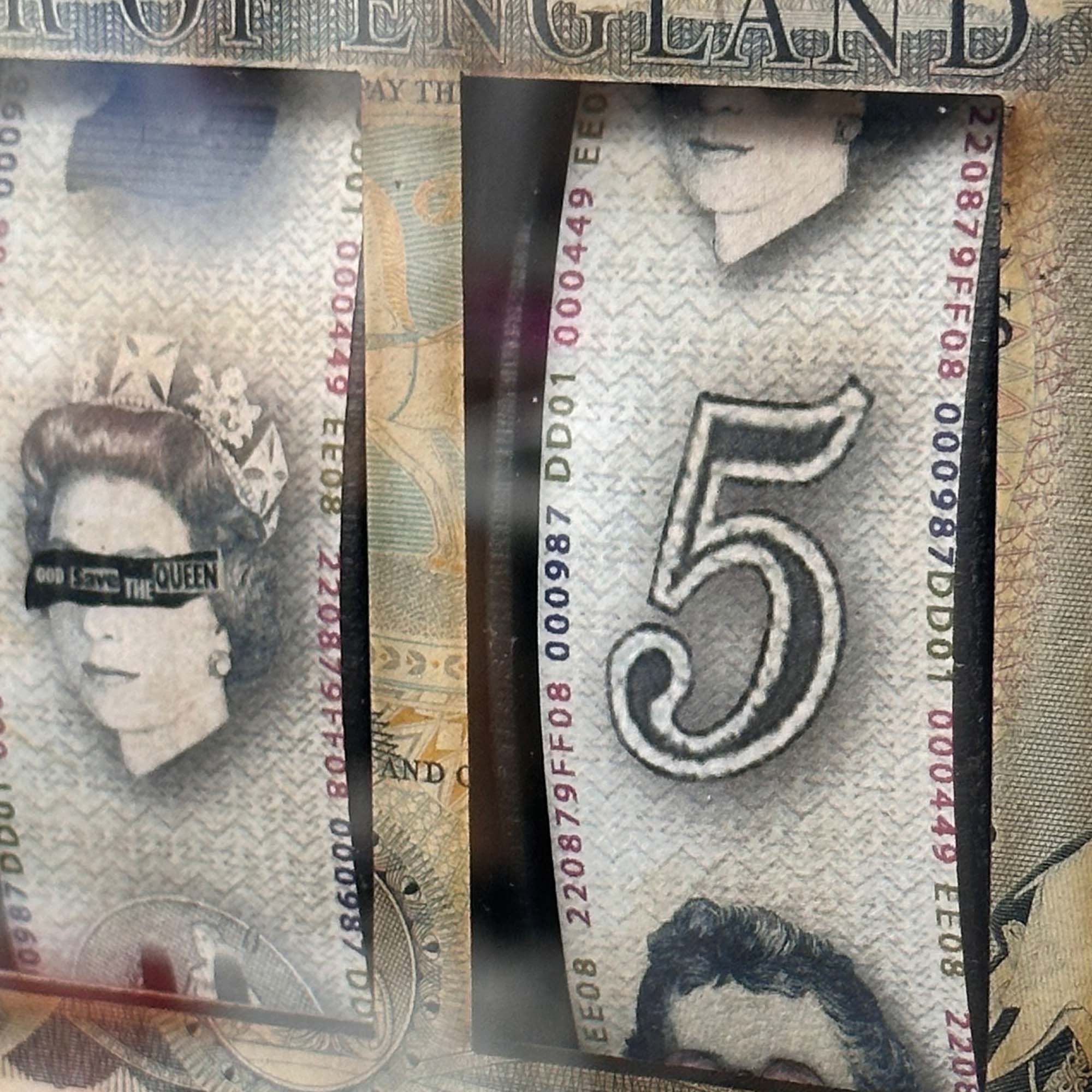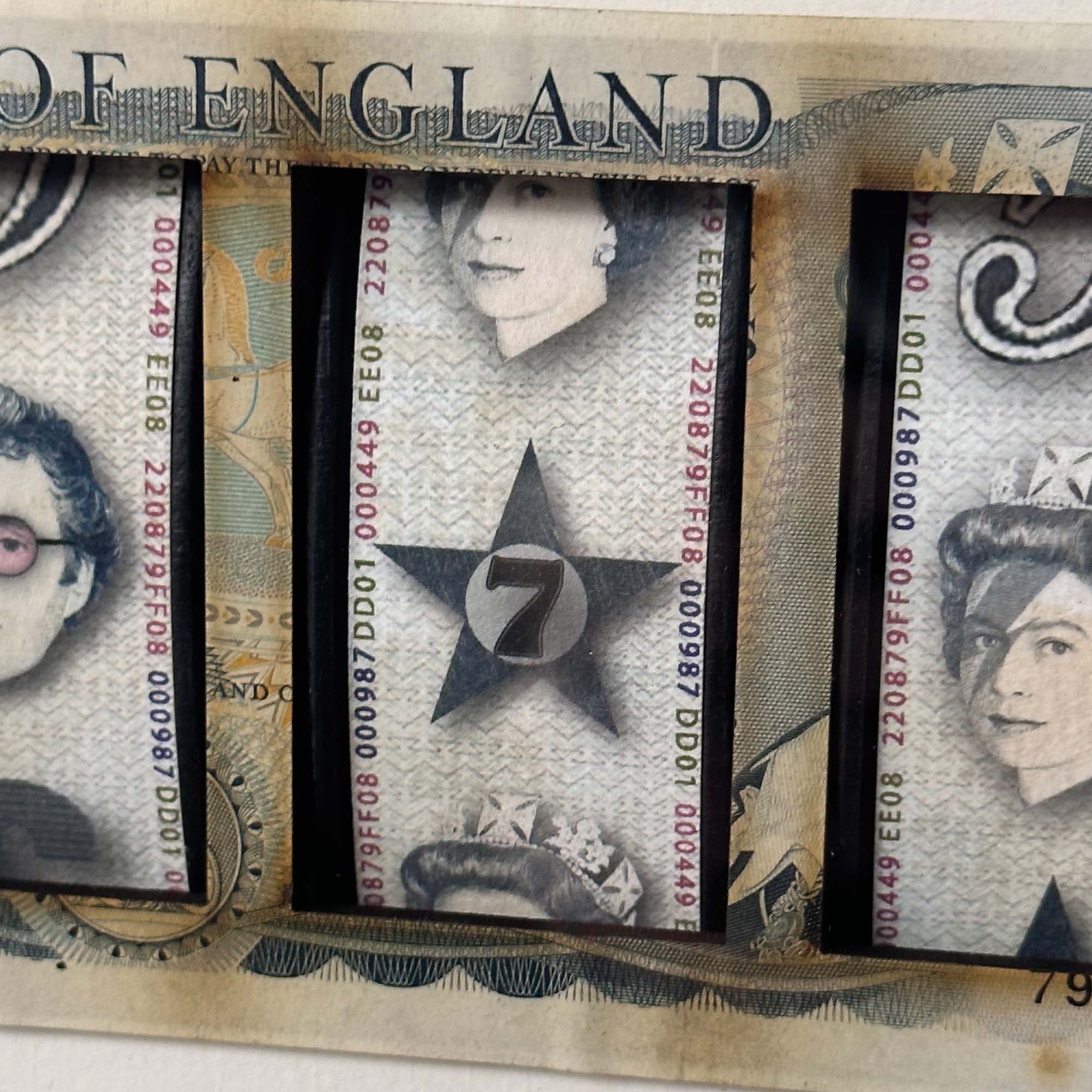 Made from original £5 notes. Based on vintage slot machines. Modified queen and Duke of wellington with additional characters. LTD edition run of 10 with each one being unique .