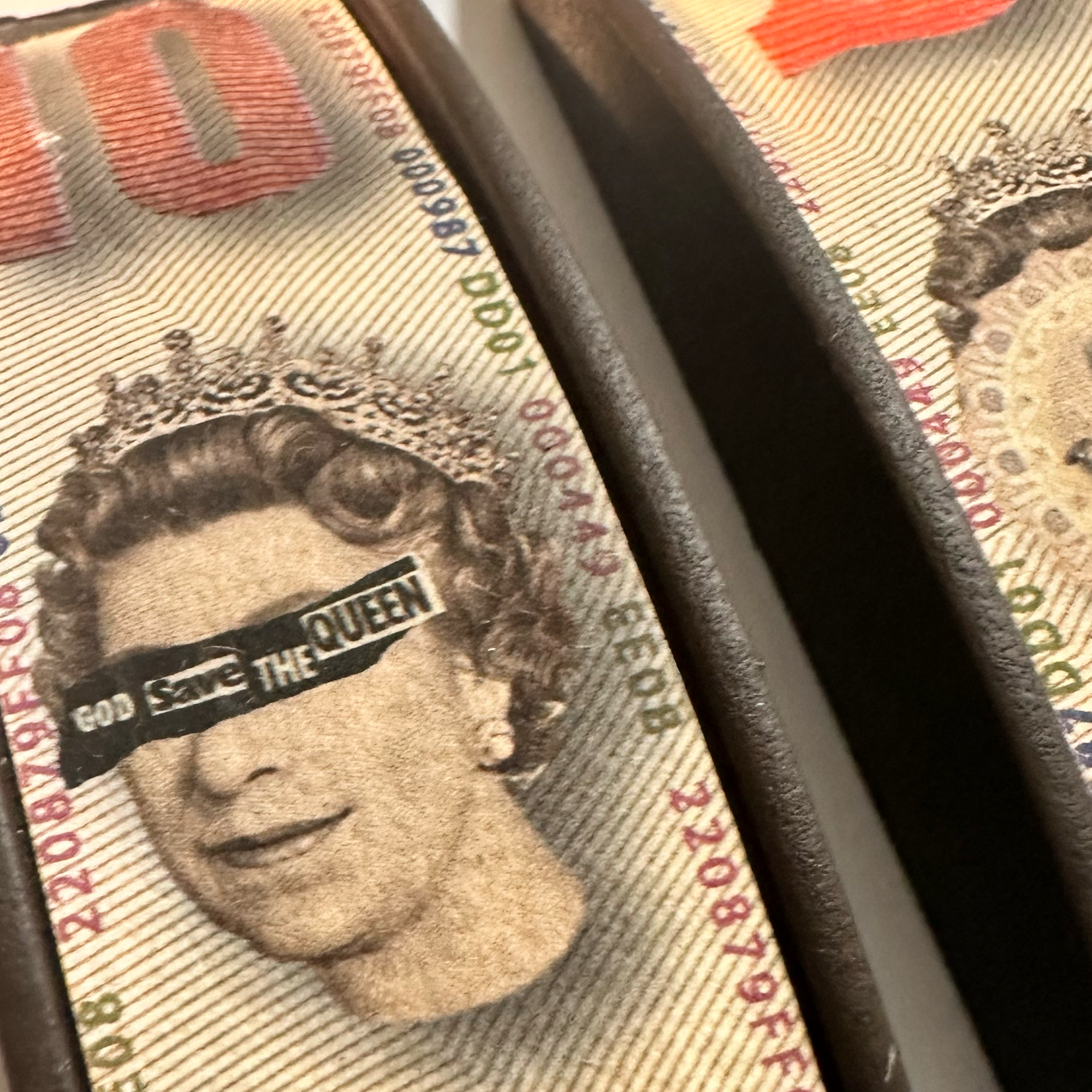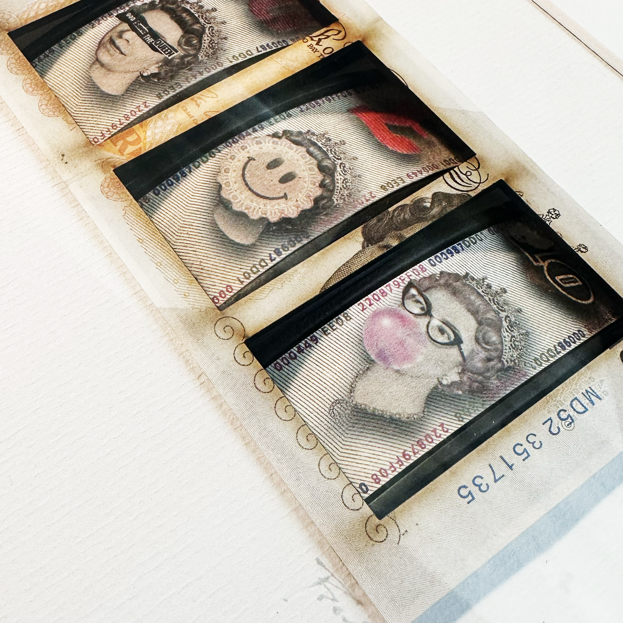 Inspired by my childhood and a misspent youth on fruit machines! Original £10 note with reimagined reels depicting iconic redrawn parts of the bank note .