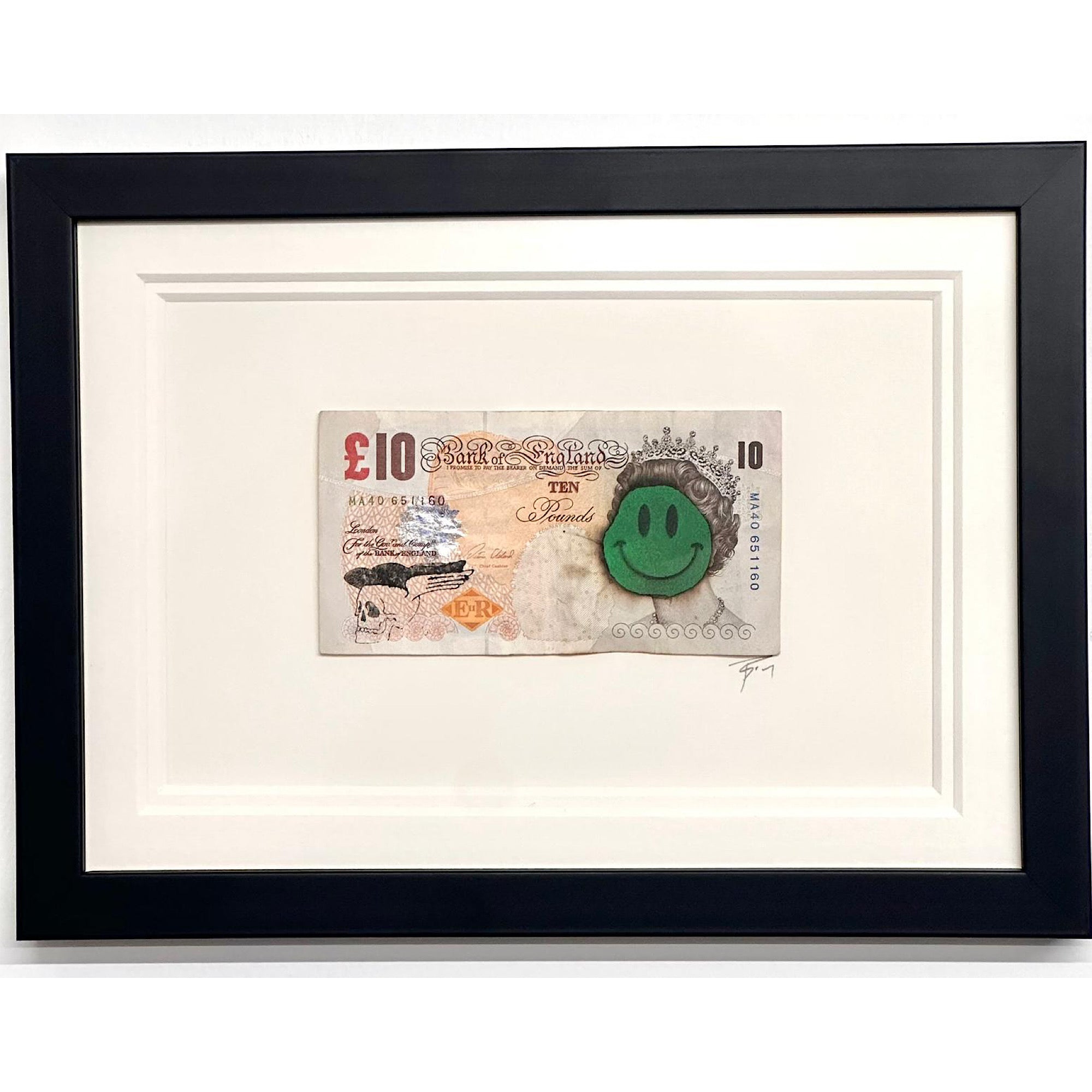 First of a small collection onto original £10 notes. Blowtorched note to reveal acid house smiley with singed edges.