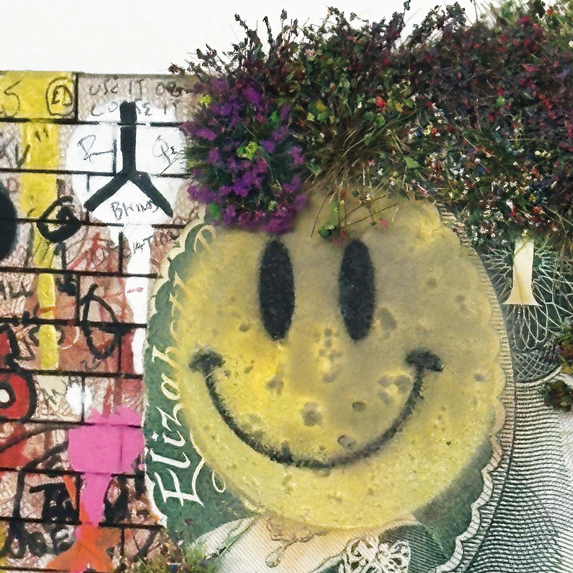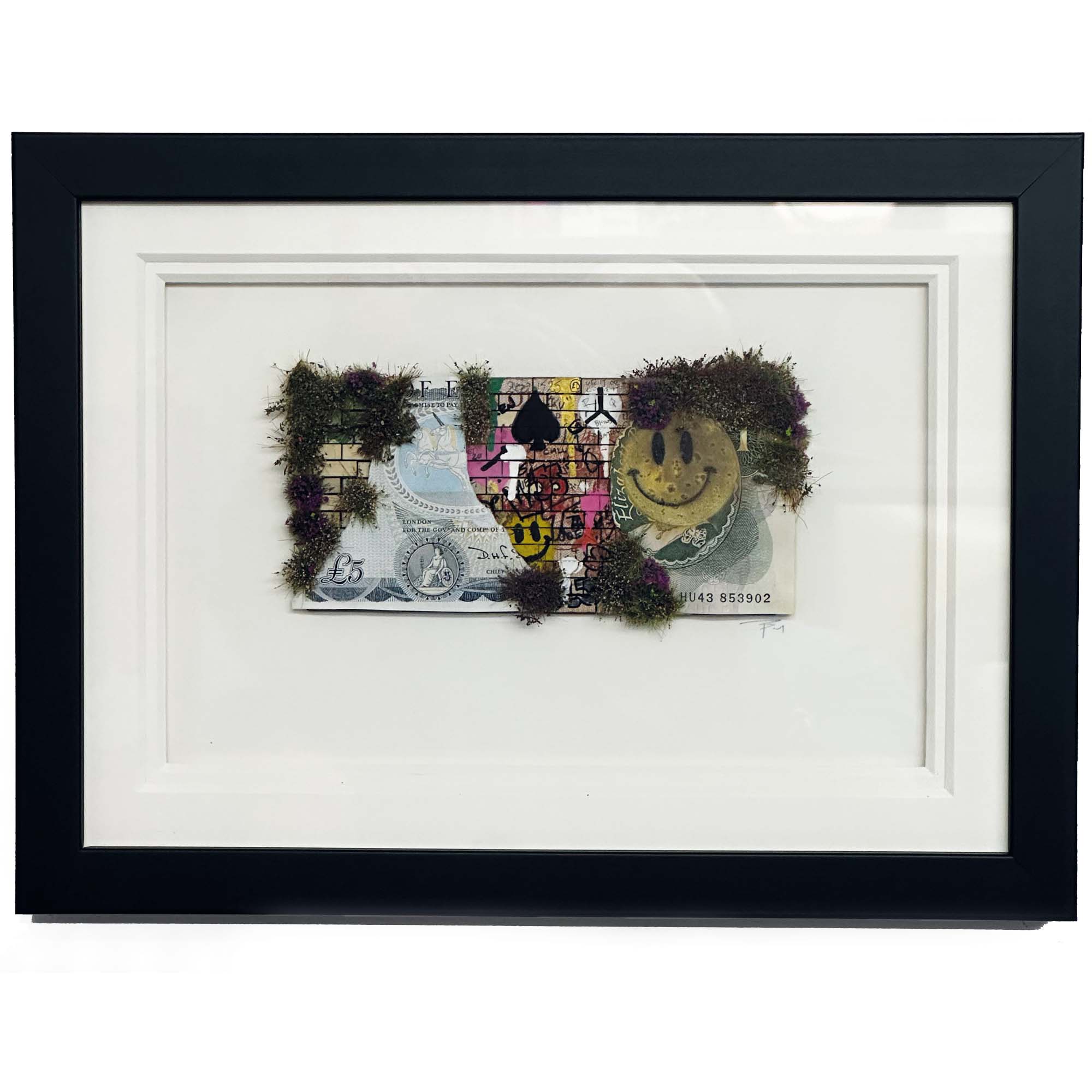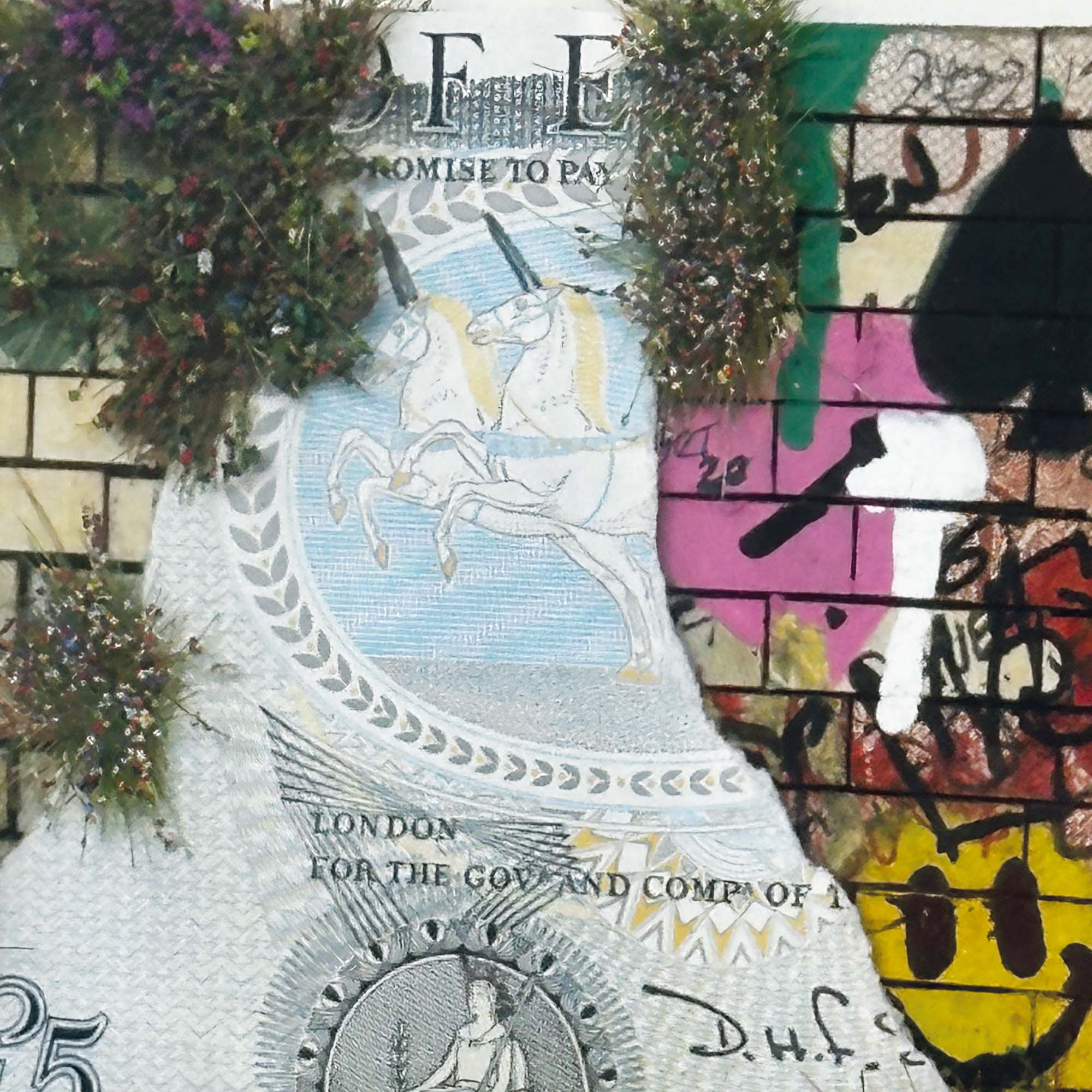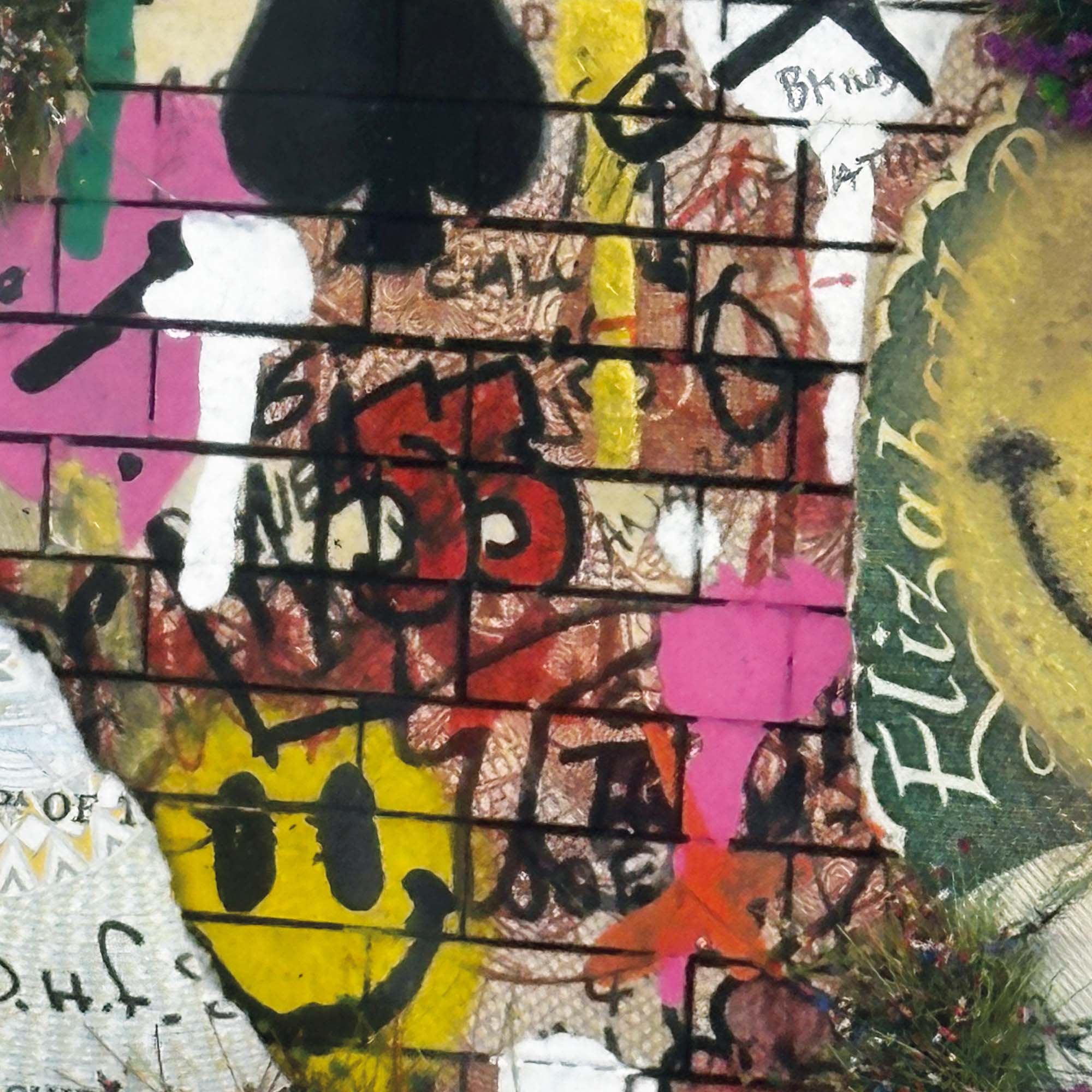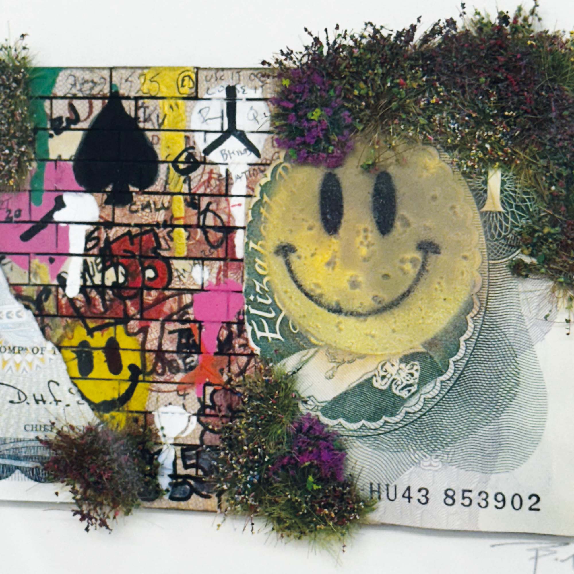 Depicting the decline in currency on our society, 'The Wall' represents an aged decaying wall built with original currency, cut into bricks and rendered with £1 and £5 notes, spray can, posca, and pen graffiti with blow torched smiley.