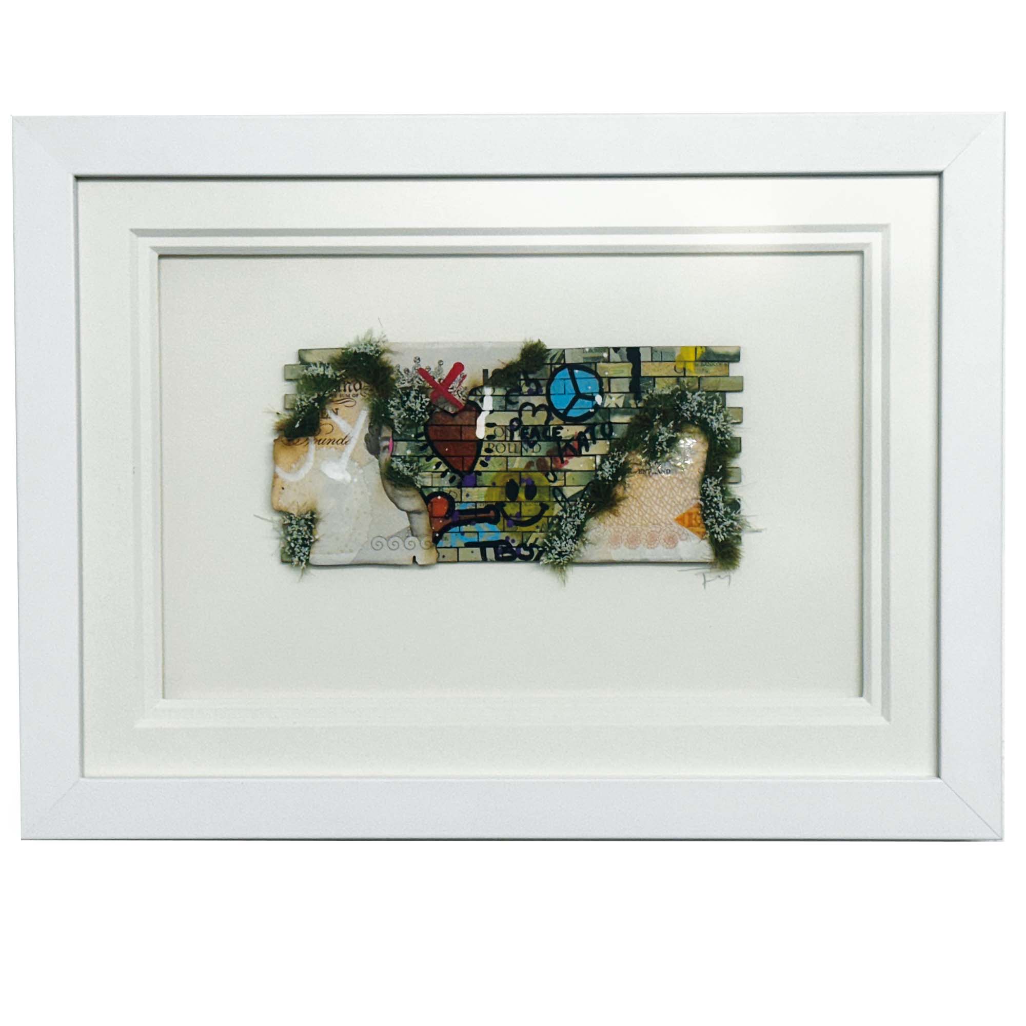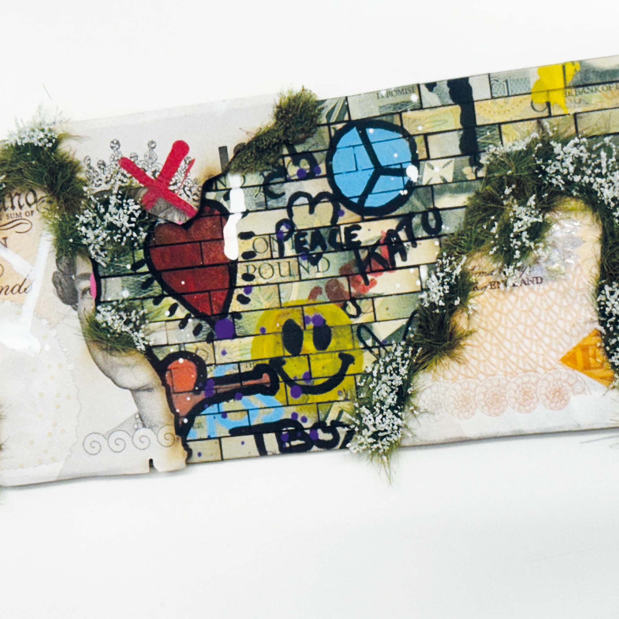 The wall reflects the decline in currency. Tiny hand cut bricks made from £1 notes, rendered with £10 note, graffiti and overgrown with moss.