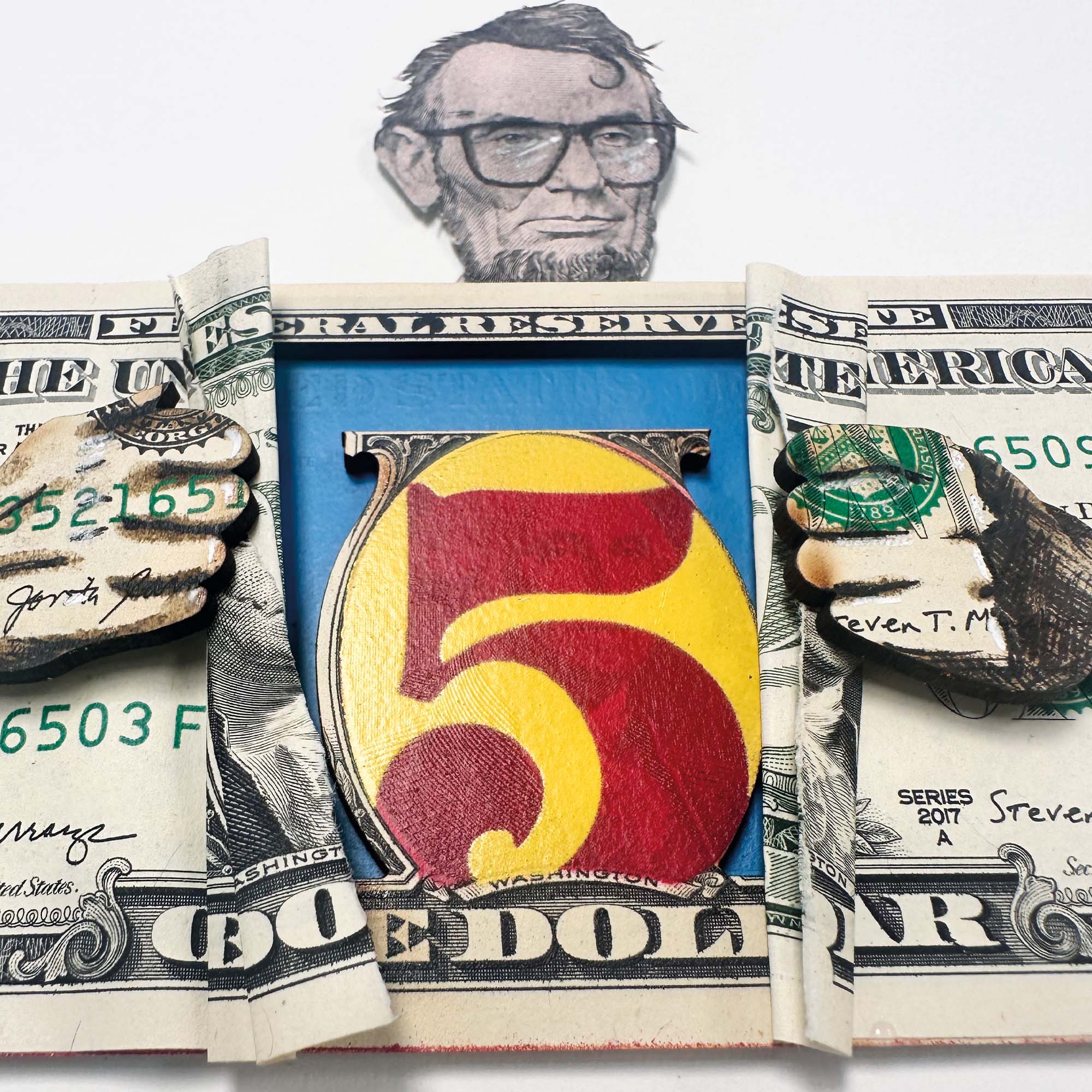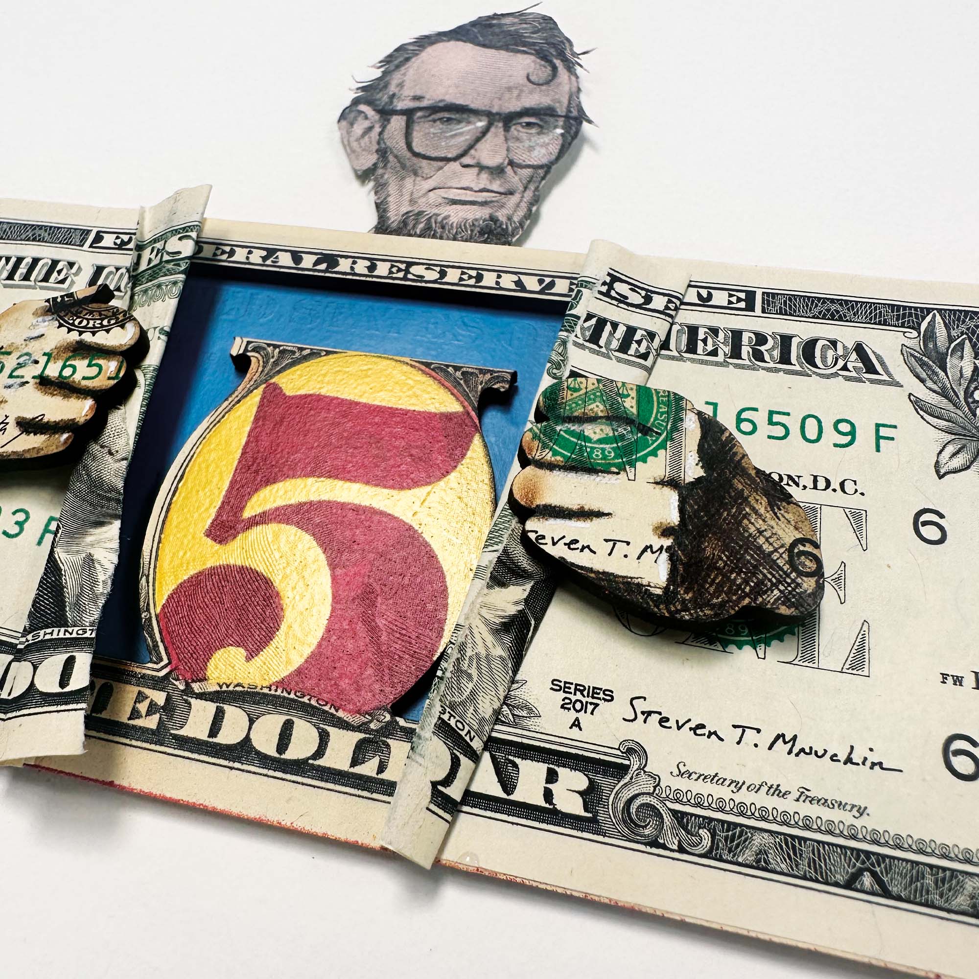 Superman inspired piece made with $1 and $5 dollar notes. Our hero rips open the note to reveal the number 5. Hand drawn with spray can and cut pieces .