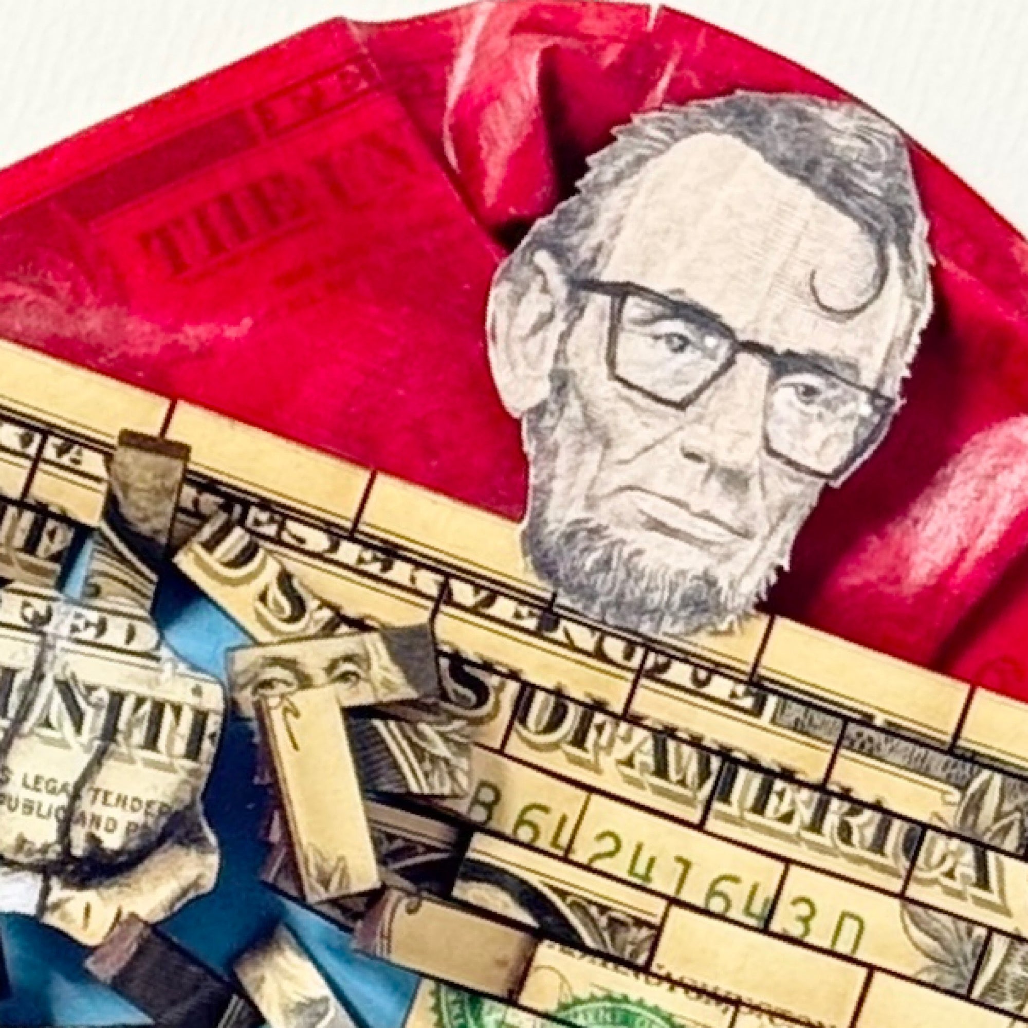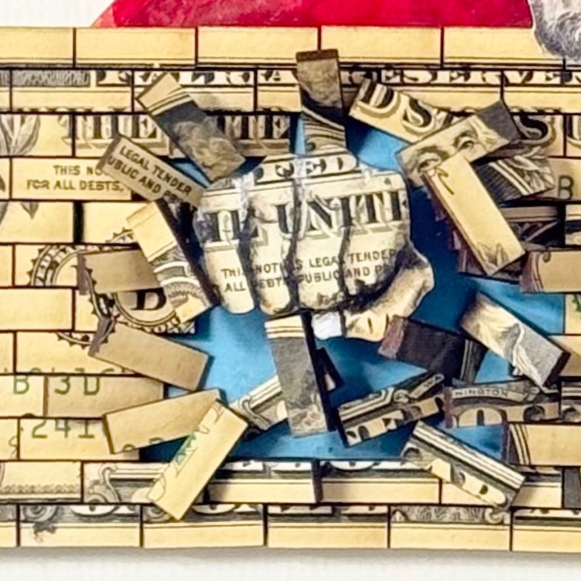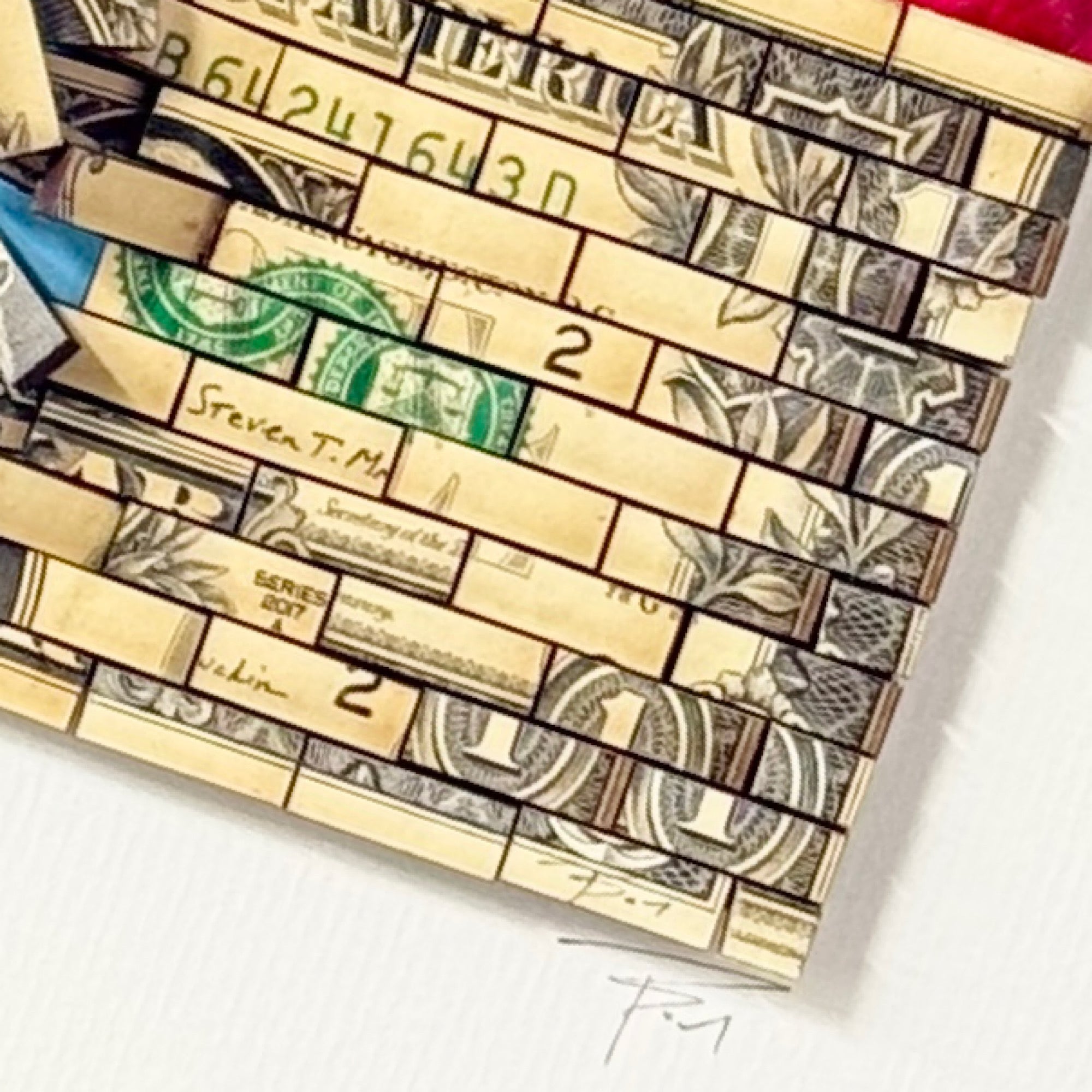 Currency cut to create wall collage, spray can work, Posca ink pens, laser cut pieces, under a genuine $1 bill.