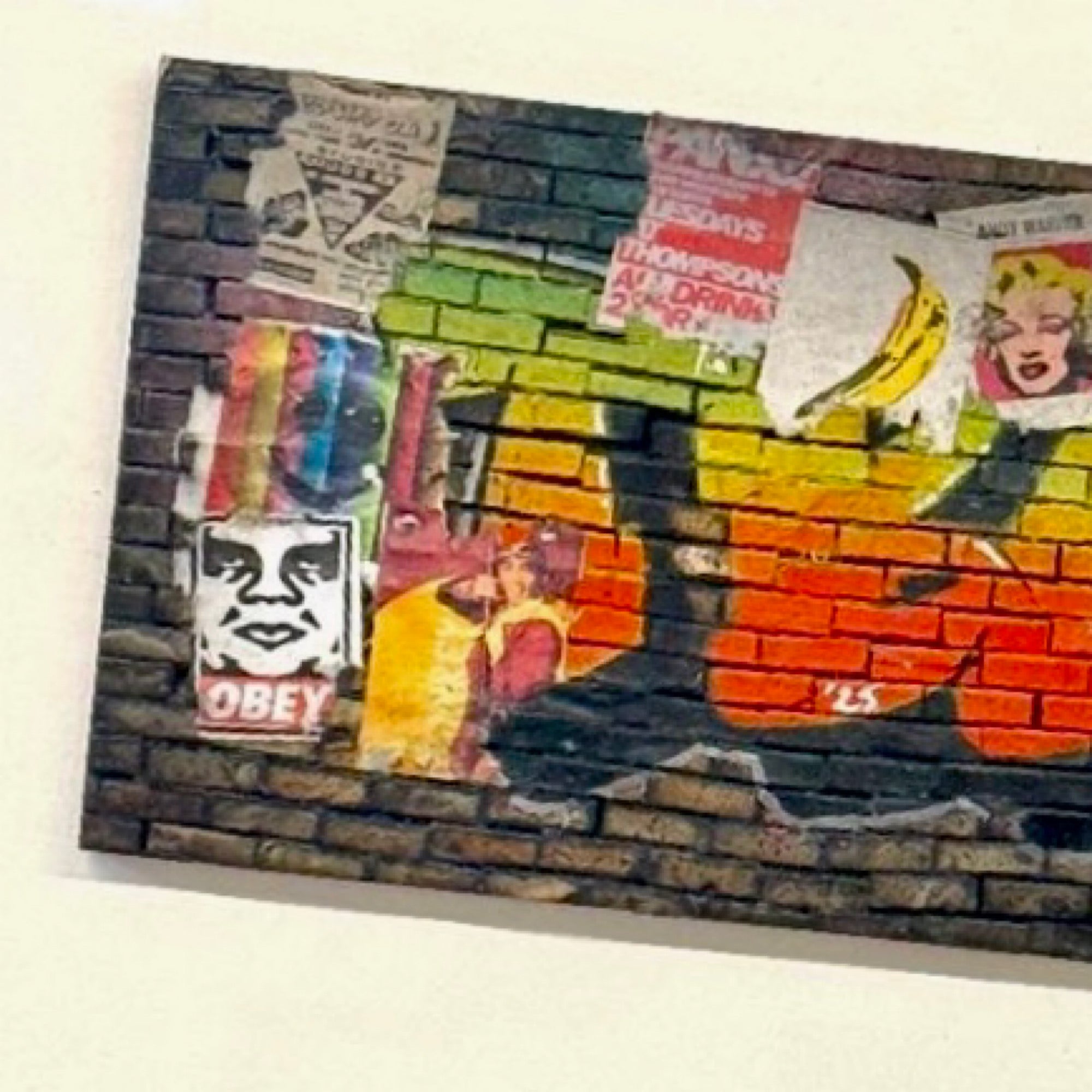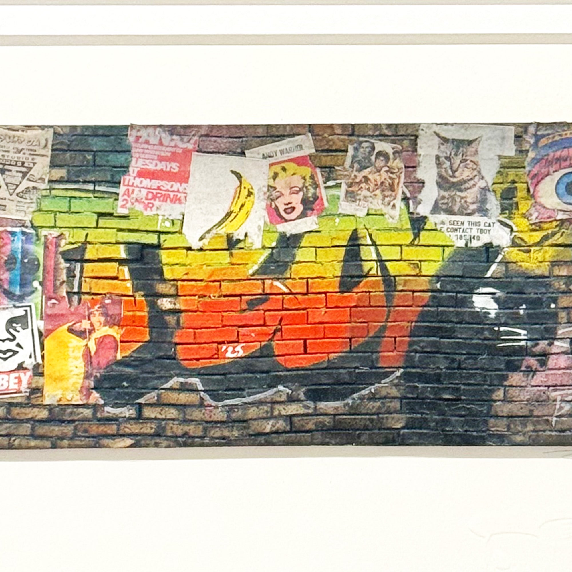 Original piece created with individual bricks, made from vintage £10 notes to create a wall. Applied graffiti and fly posters.