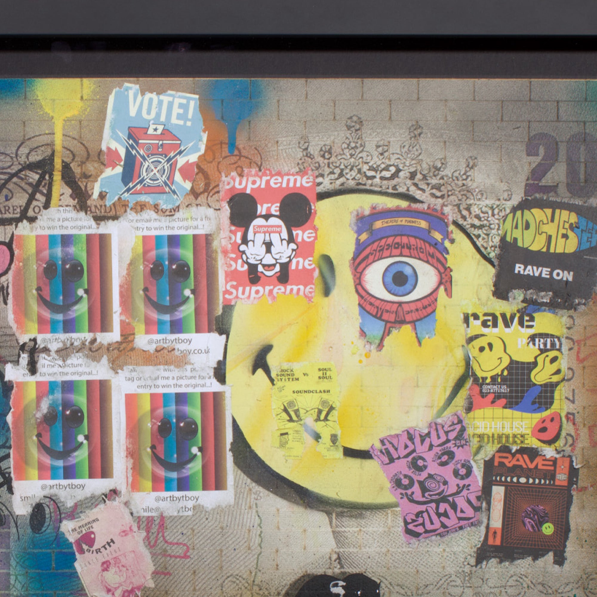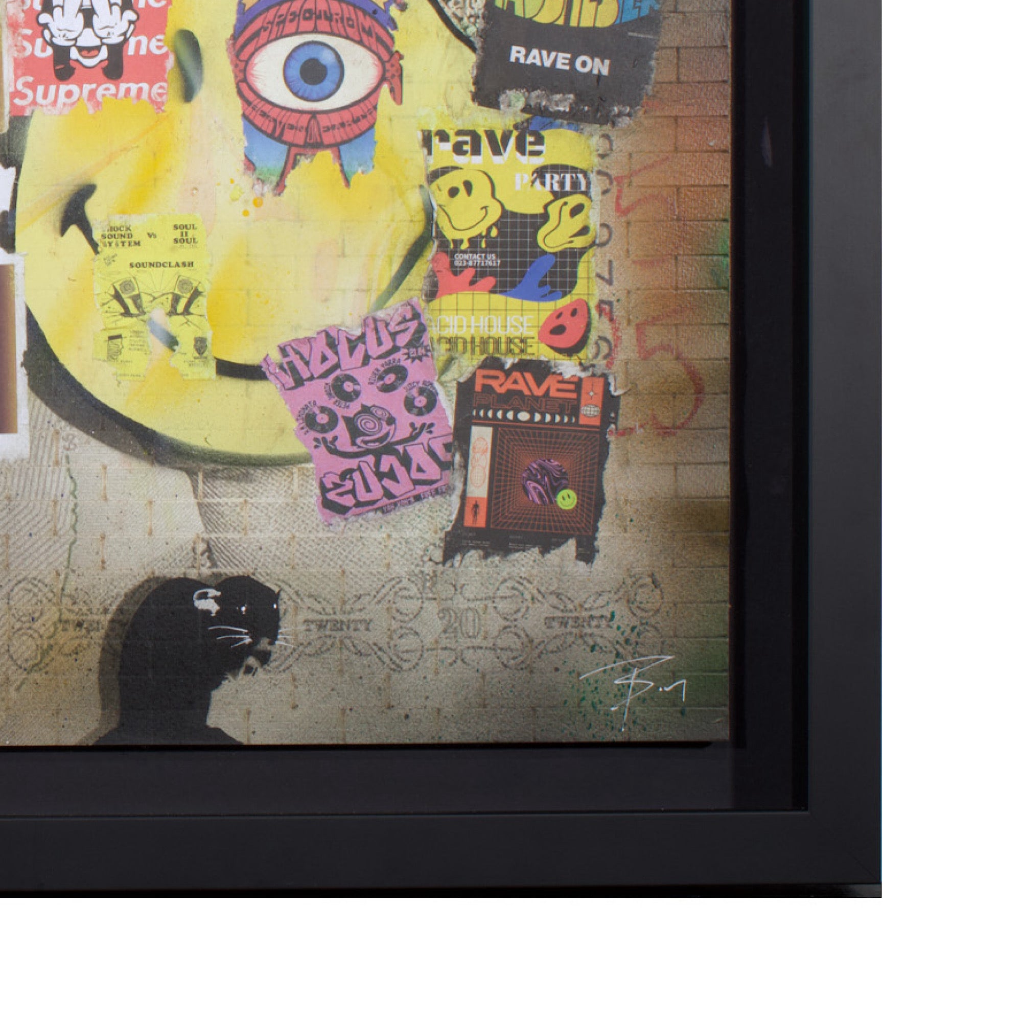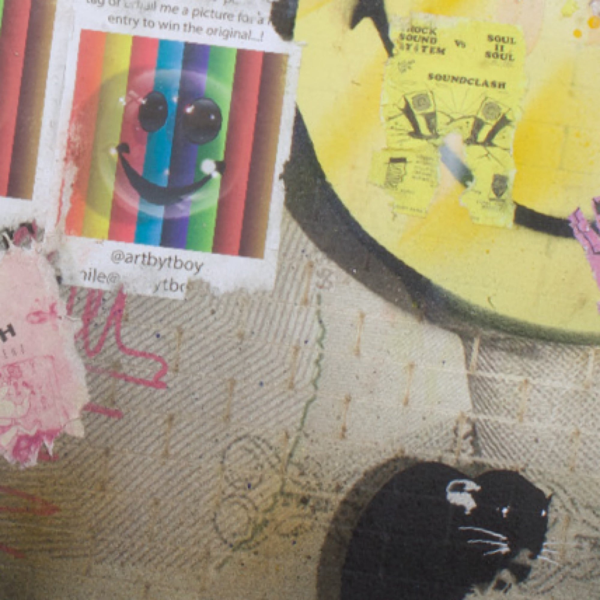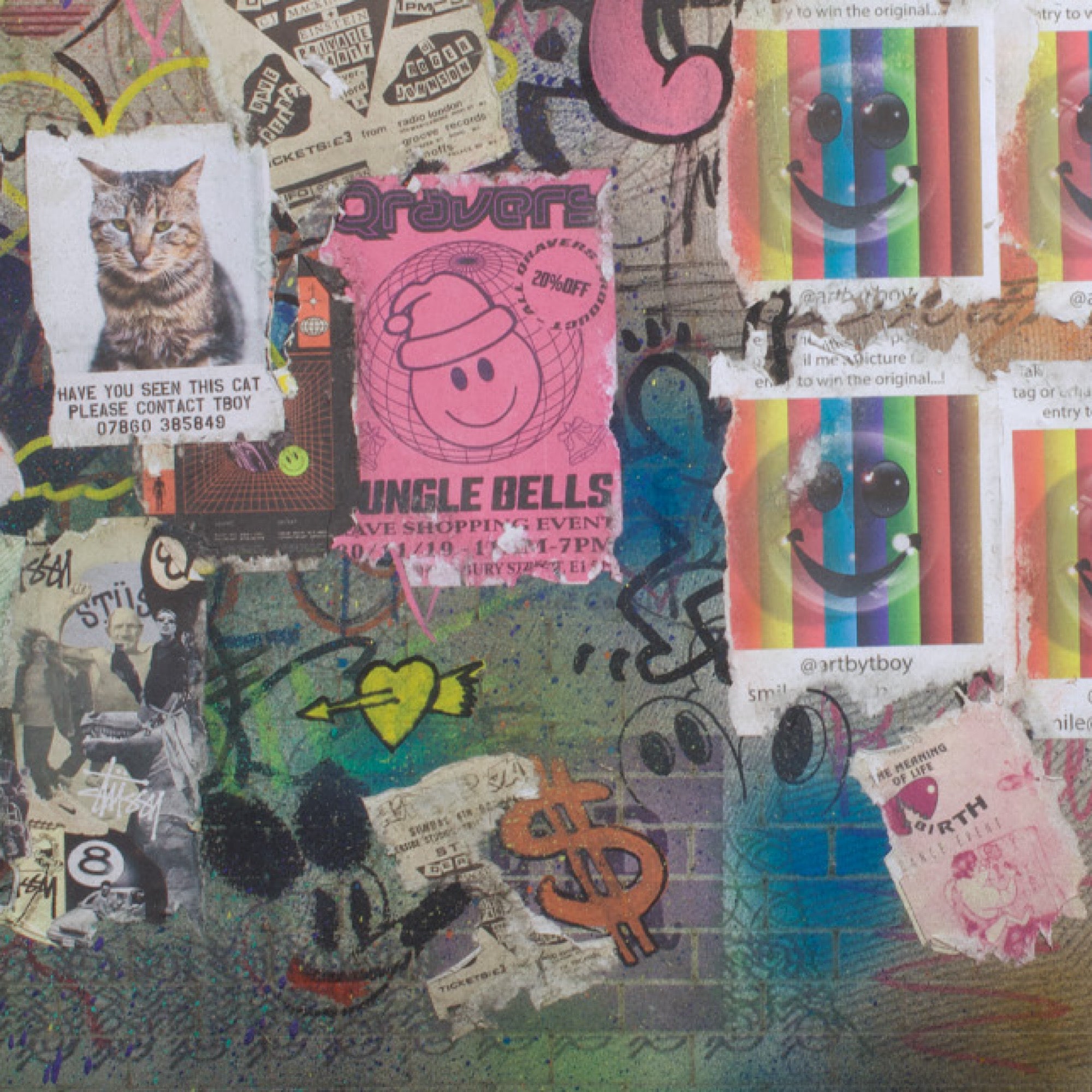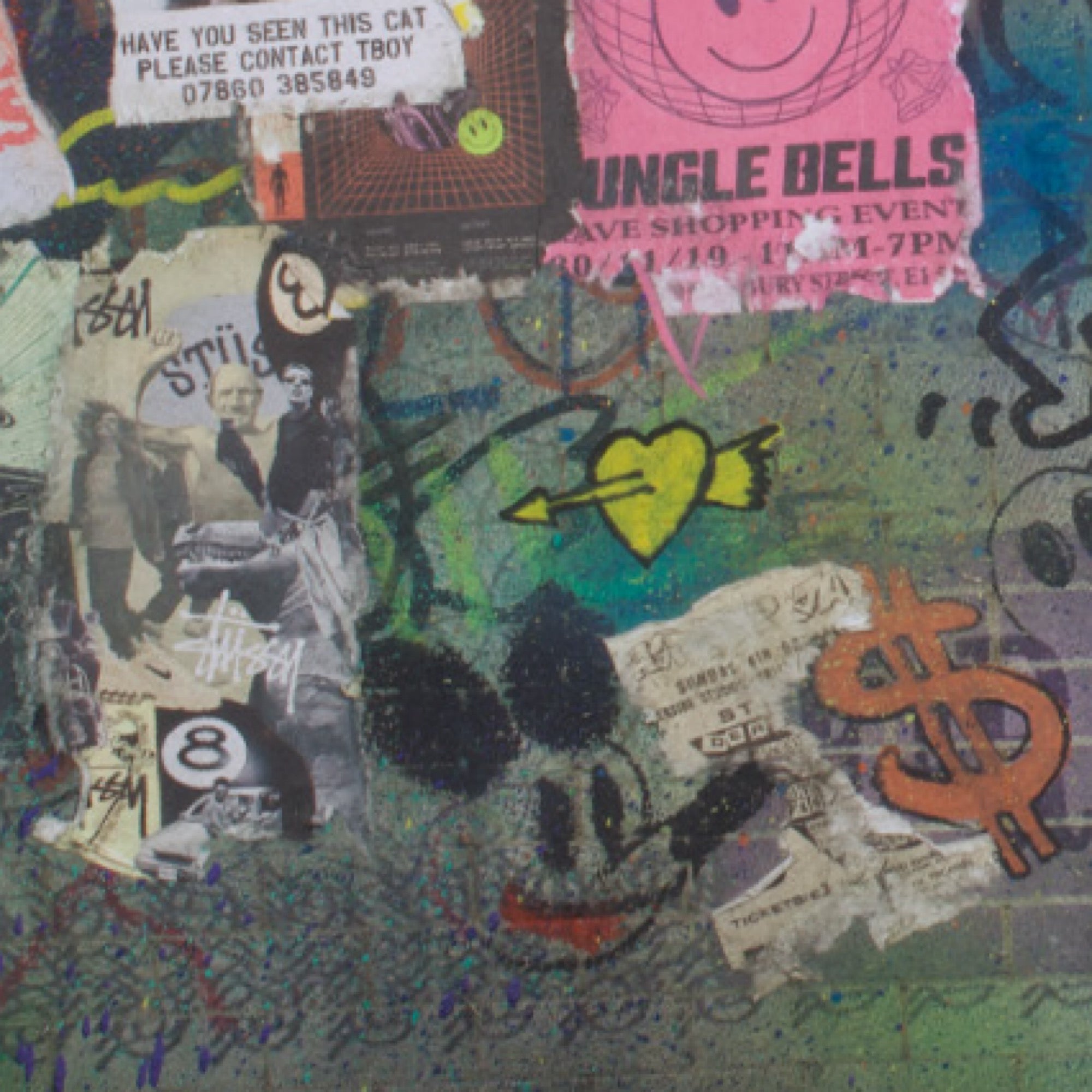Made with laser cut currency wall, spray can, collage, stencil work and fly posters