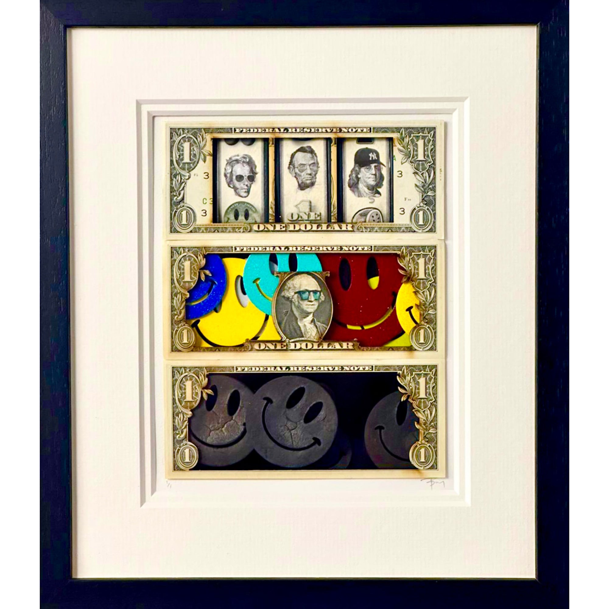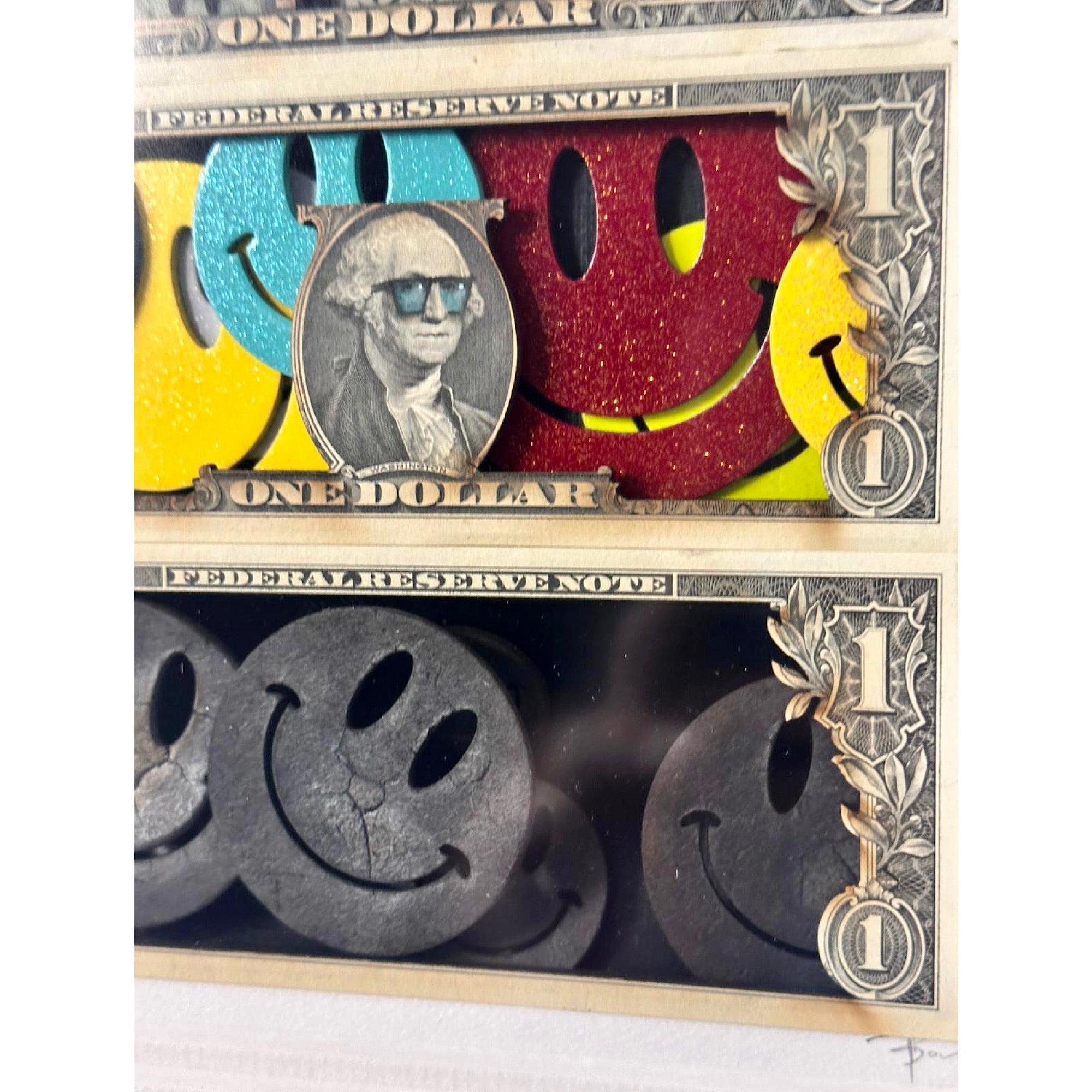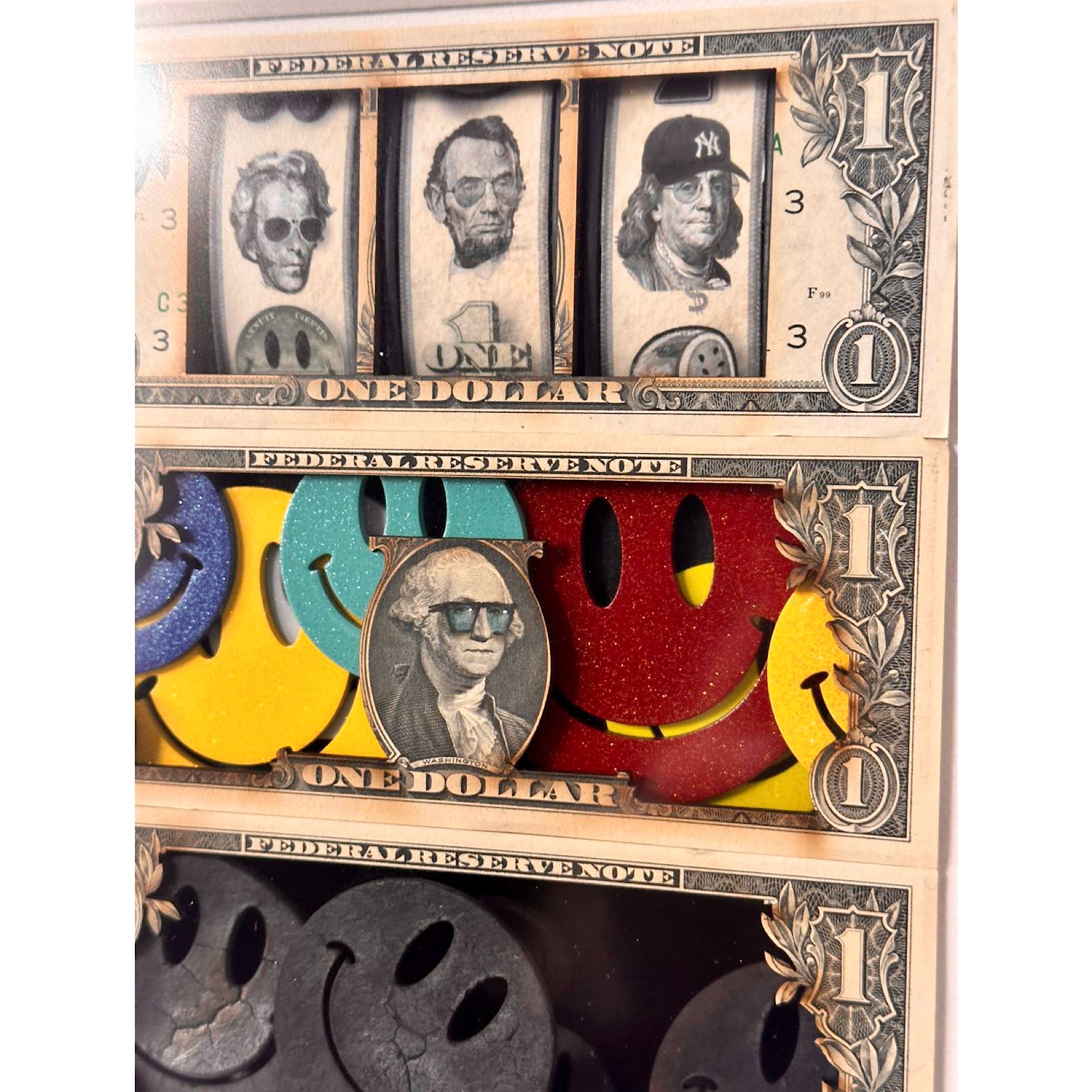 Original $1 notes with applied reels, featuring presidents and figures, blow torched and painted smileys, hand drawn detailing.
