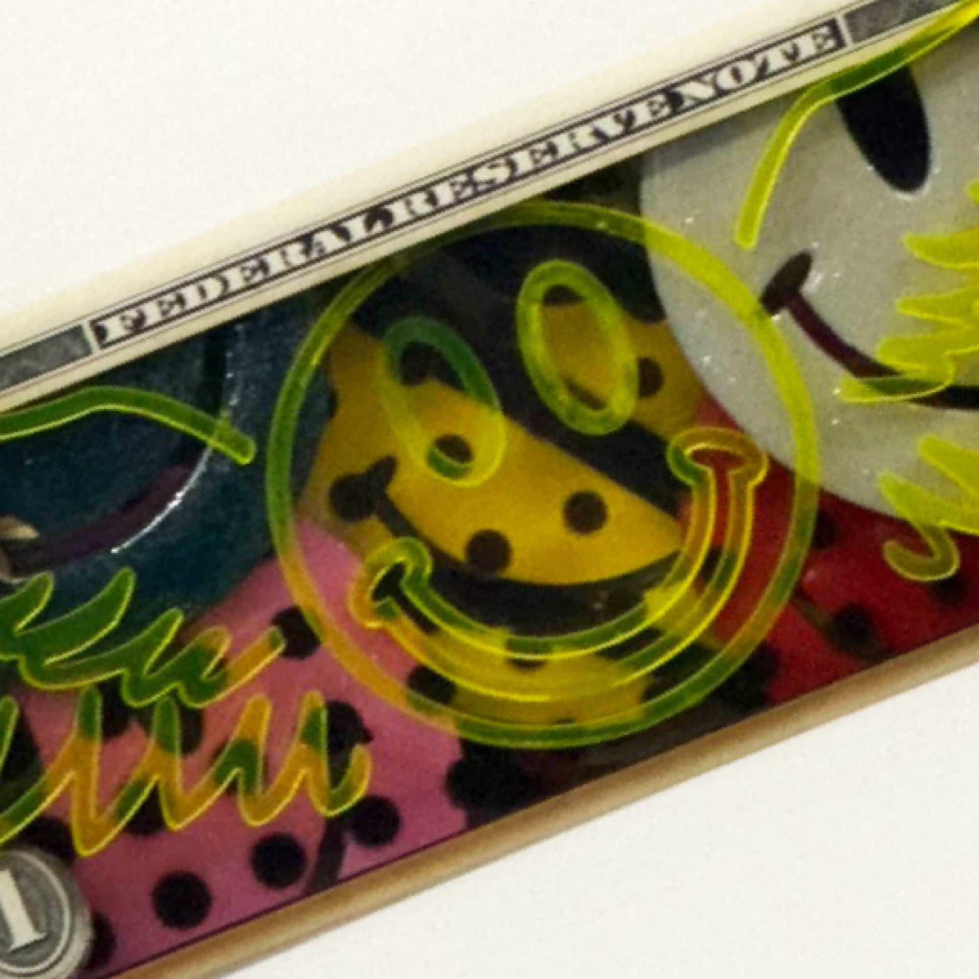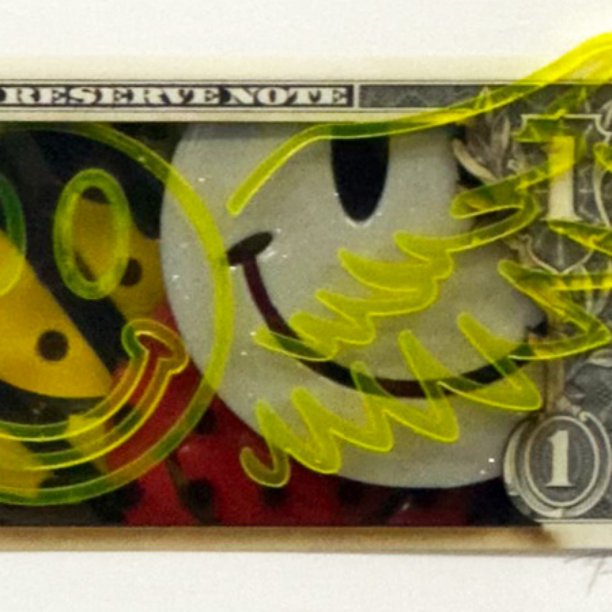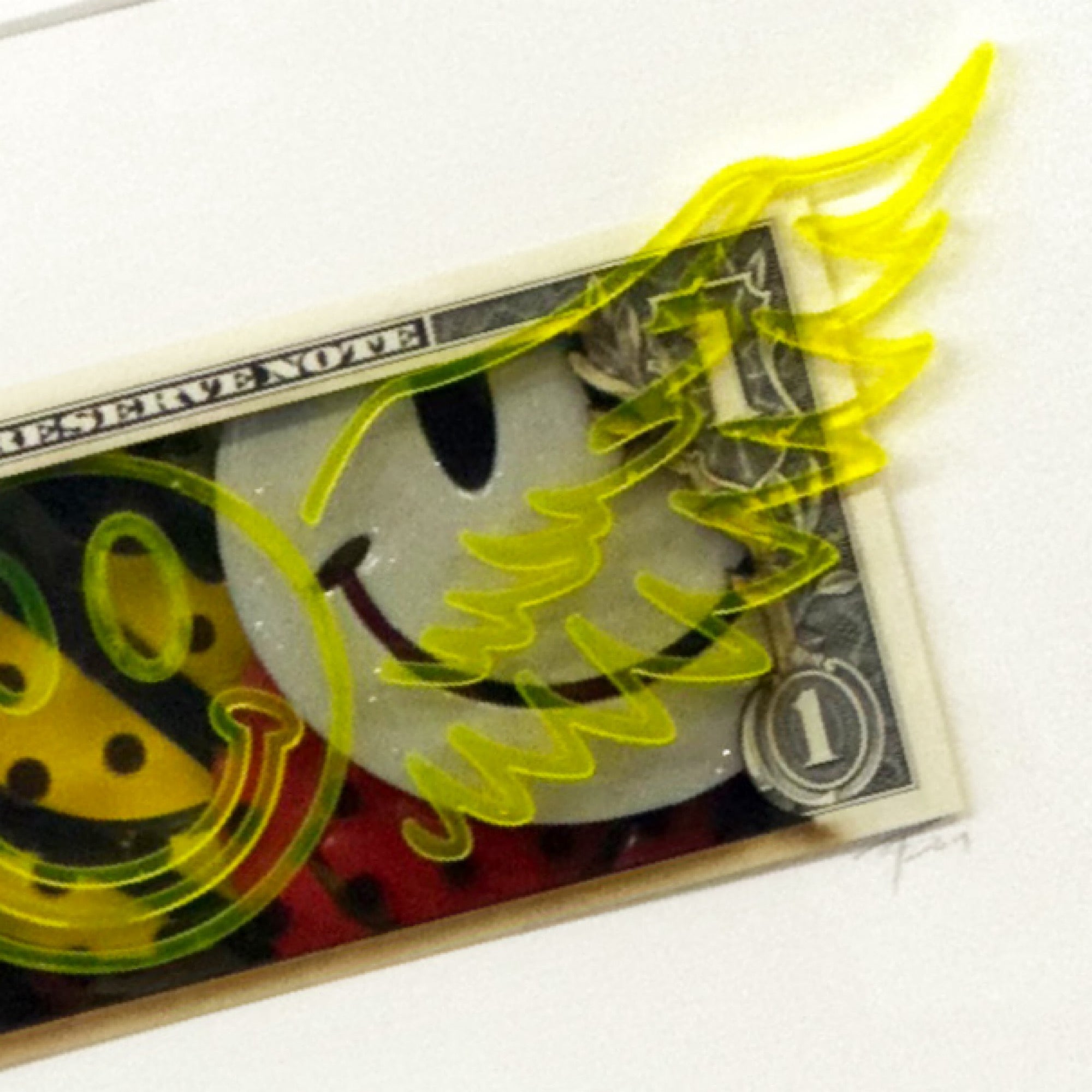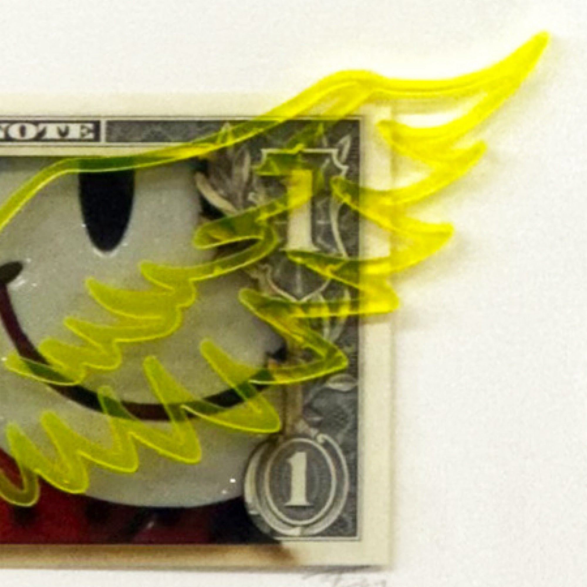Detailed abstract piece built in layers under original dollar note and layers of acrylic with laser cut acrylic wings