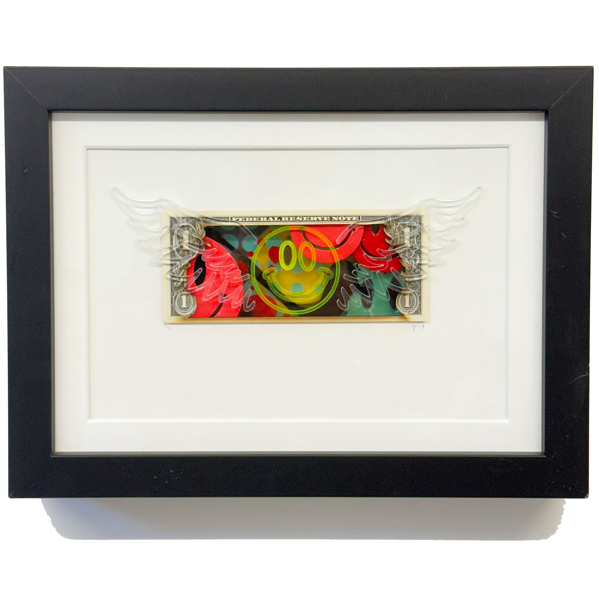 Detailed abstract piece built in layers under original dollar note and layers of acrylic with laser cut acrylic wings